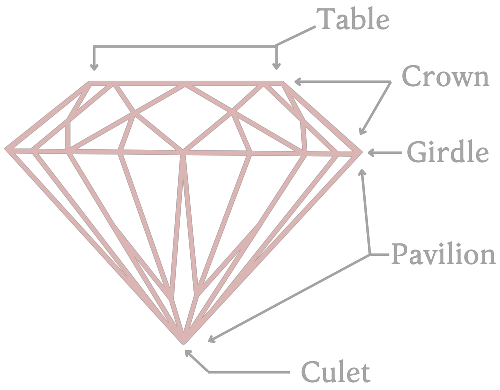 Based on the natural octahedral shape of the diamond in its uncut state, to retain the most weight in the stone there is a high crown angle, deep pavilion, large culet and a small table in an Old Mine Cut diamond.