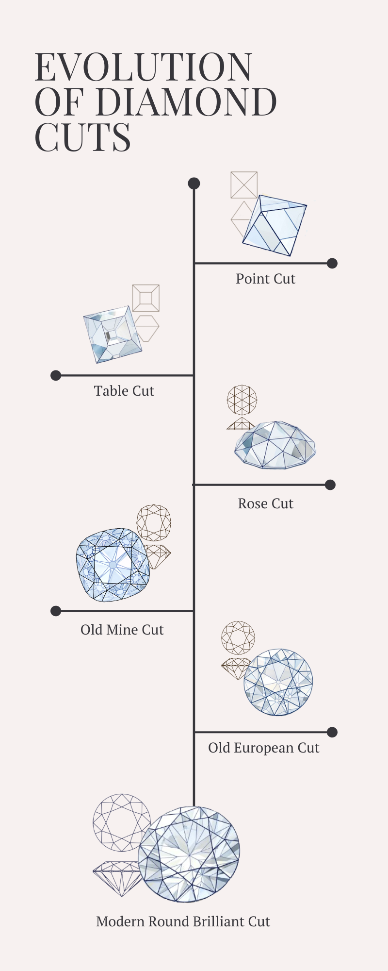 Diamonds are the hardest material on Earth and were prized in ancient times for their strength above all. The practice of diamond cutting began in the Indian subcontinent in the 6th century and European cutting practices starting in the 14th century where the crystal’s original facets were simply polished to even out nature’s octahedral design, called a point cut. The table cut was the next evolution in diamond cutting where one of the points would be ground off, creating the table facet.