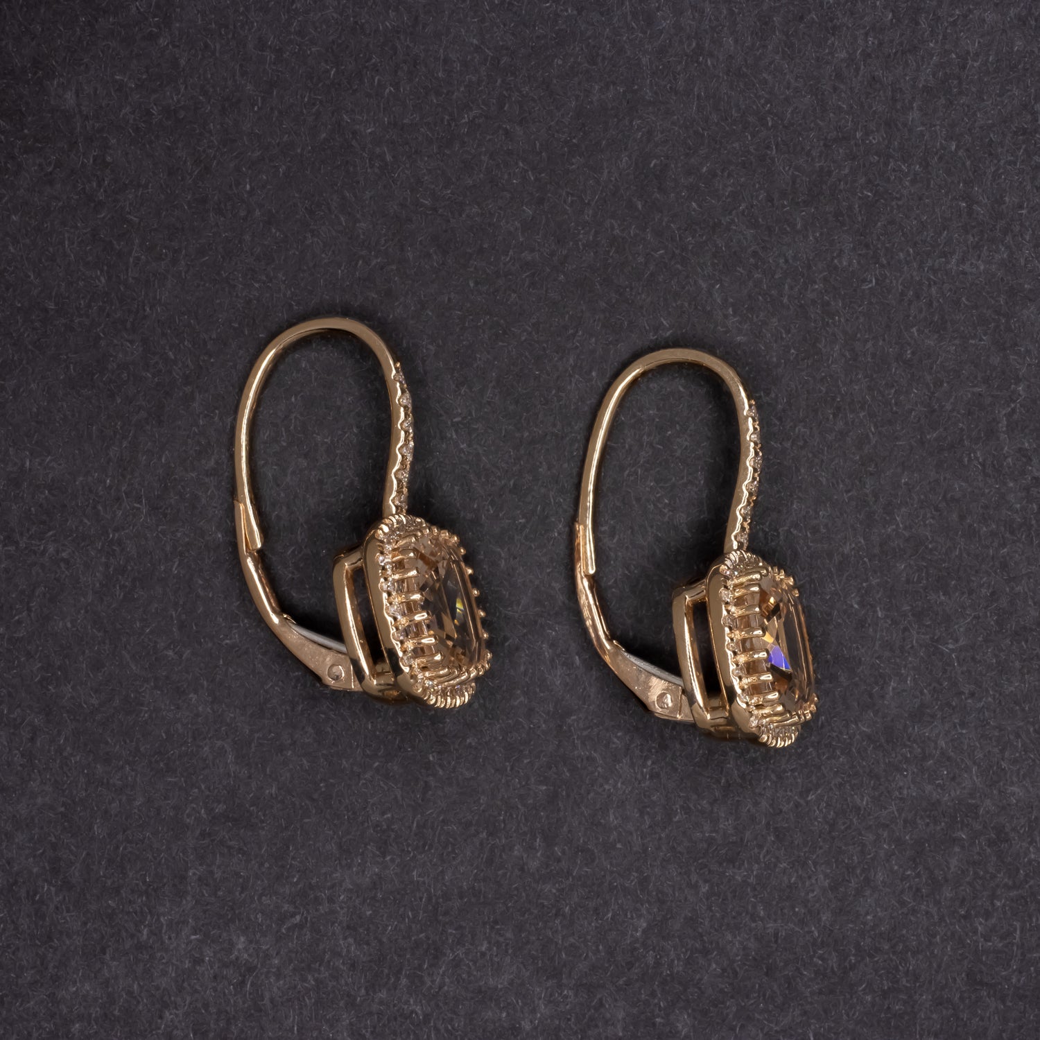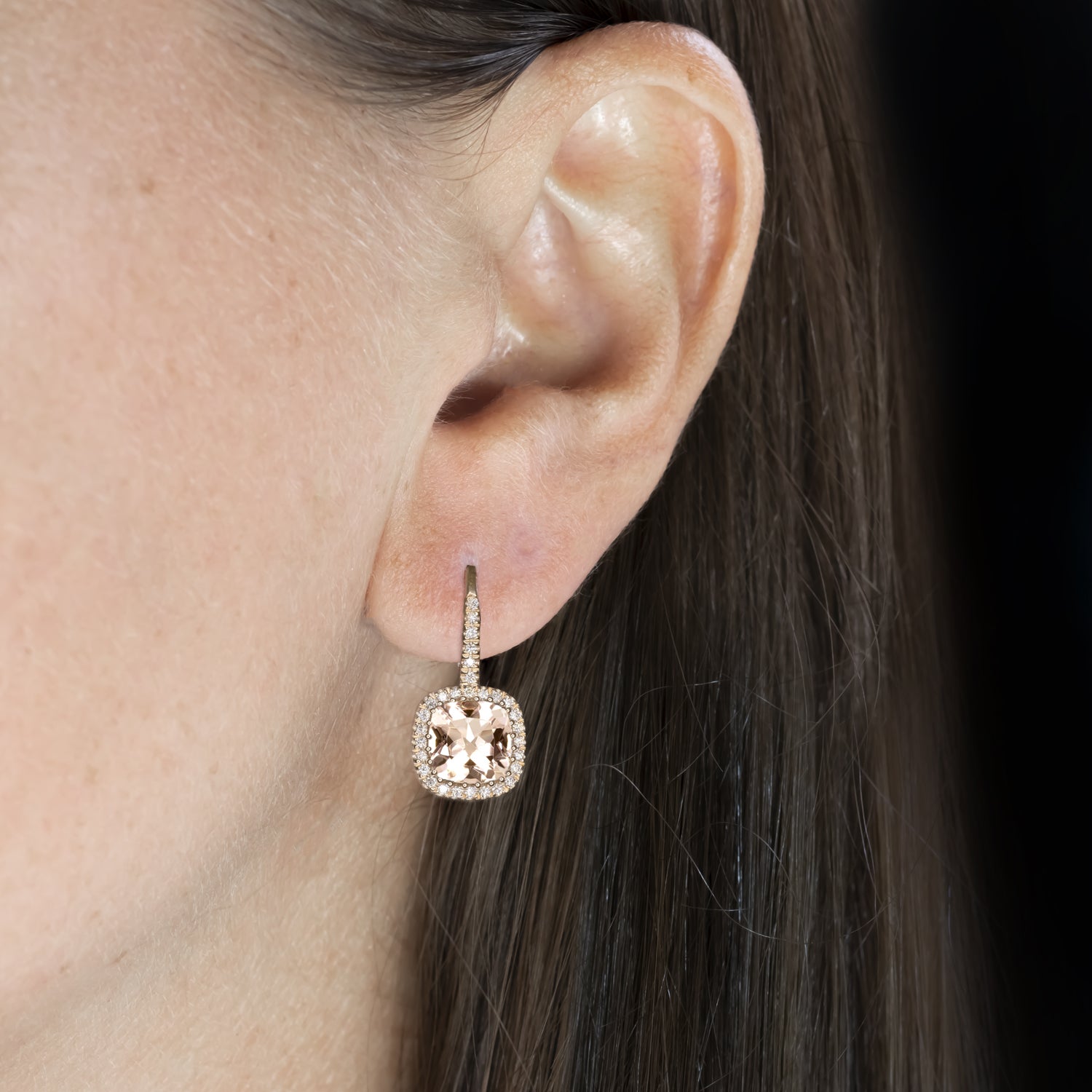 MORGANITE DIAMOND DROP EARRINGS CUSHION SHAPE 14k ROSE GOLD HALO PEACH PINK