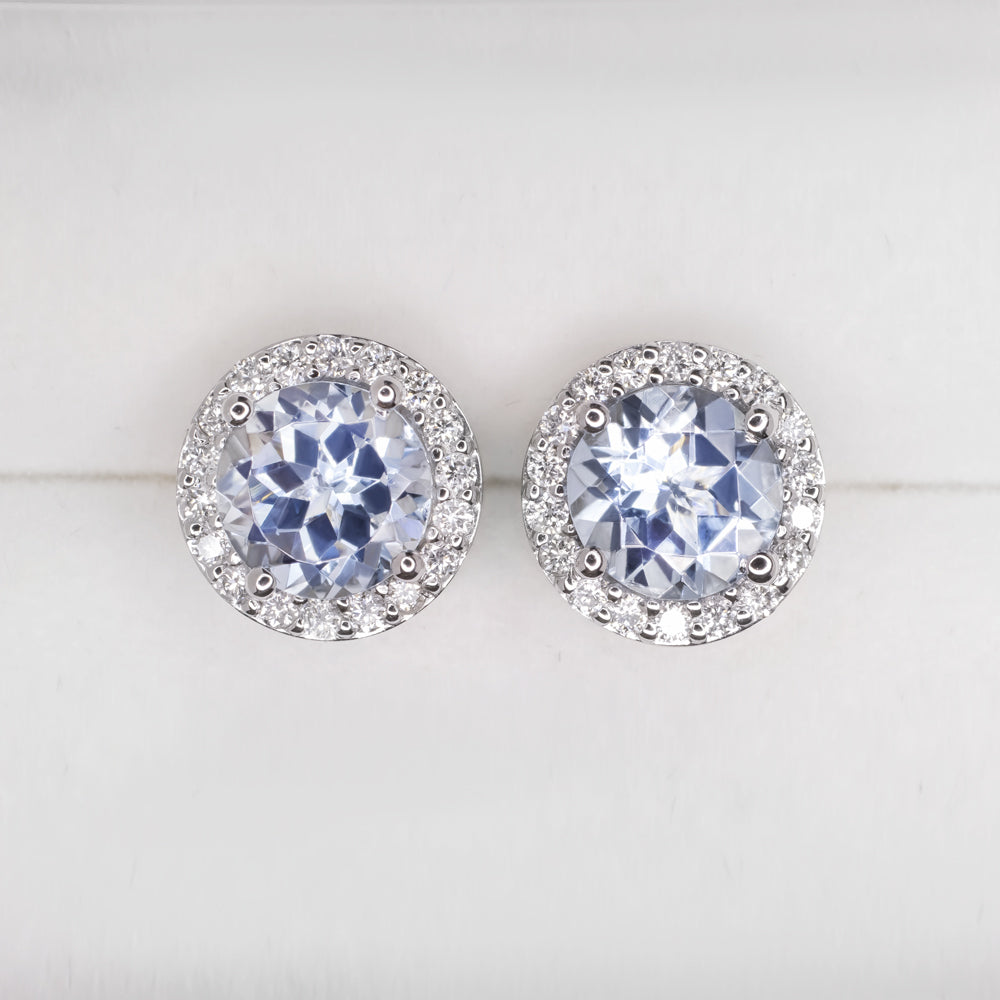 NATURAL AQUAMARINE DIAMOND STUD EARRINGS ROUND CUT 14k WHITE GOLD HALO BLUE