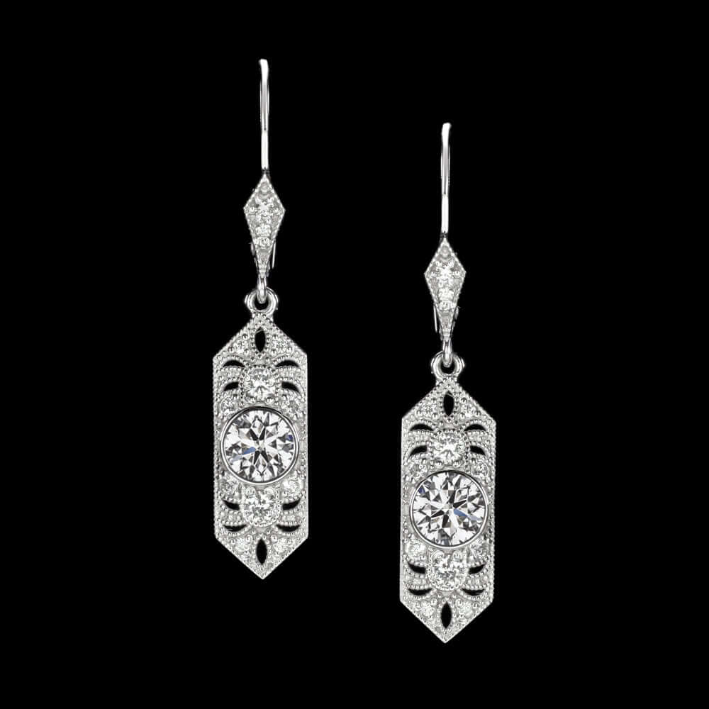 These elegant and brilliantly sparkling diamond earrings bring the glamour with a chic and sophisticated Art Deco style design! The geometric settings are encrusted with diamonds and beautifully adorned with intricate cut outs and fine milgrain. Graceful and luxurious, these timelessly glamorous and elegant earrings would make a splendid treat for yourself or an excellent gift for an anniversary or special occasion!