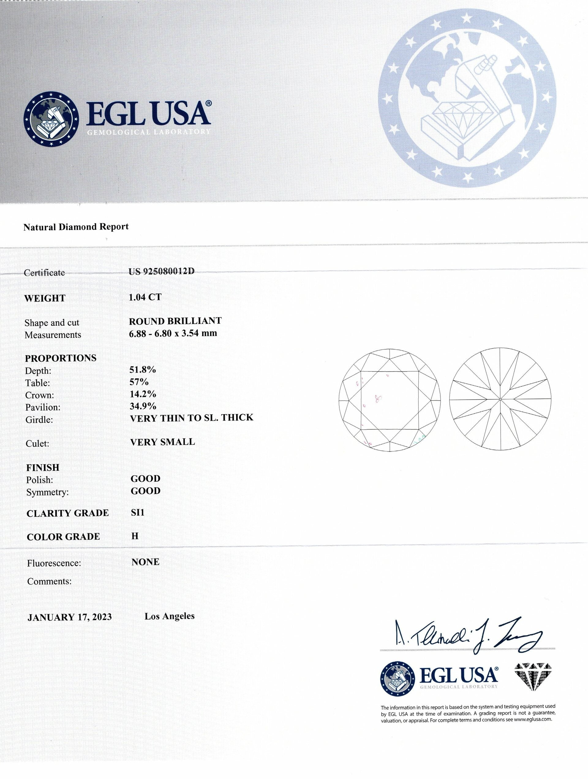 This 1.04 carat round brilliant cut diamond is beautifully white, completely eye clean, and displays stunning, lively sparkle! Certified by EGL-USA, the diamond is graded SI1 for clarity, and it is 100% eye clean. It has a great spread at 6.85mm and a large look for its weight! The inclusions are minor and blend in perfectly with the sparkle. Graded H for color, the diamond faces up beautifully white and shows no warmth. It will stand out brightly against any background and in any setting. Overall, this is a gorgeous diamond with an eye-catching, bright and lively display of fire! With its beautiful white color, perfect 1 carat size, clean appearance, and phenomenally brilliant sparkle, this diamond is a perfect choice for an engagement or right hand ring!