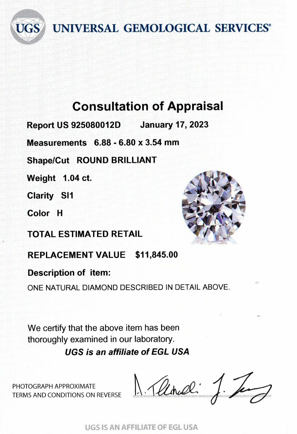1.04ct CERTIFIED H SI1 DIAMOND 6.85mm LOOSE ROUND CUT NATURAL EARTH MINED 1ct
