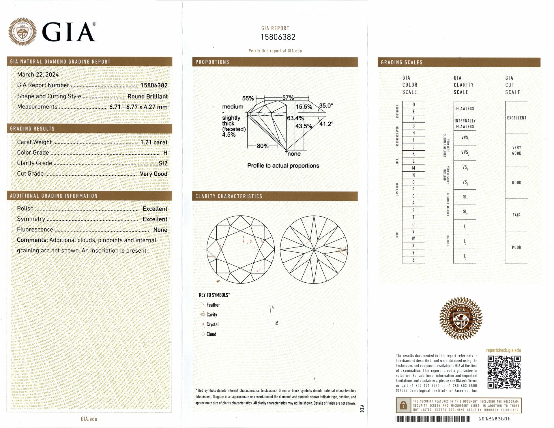 1.21ct GIA CERTIFIED DIAMOND VERY GOOD ROUND BRILLIANT CUT H SI2 LOOSE NATURAL