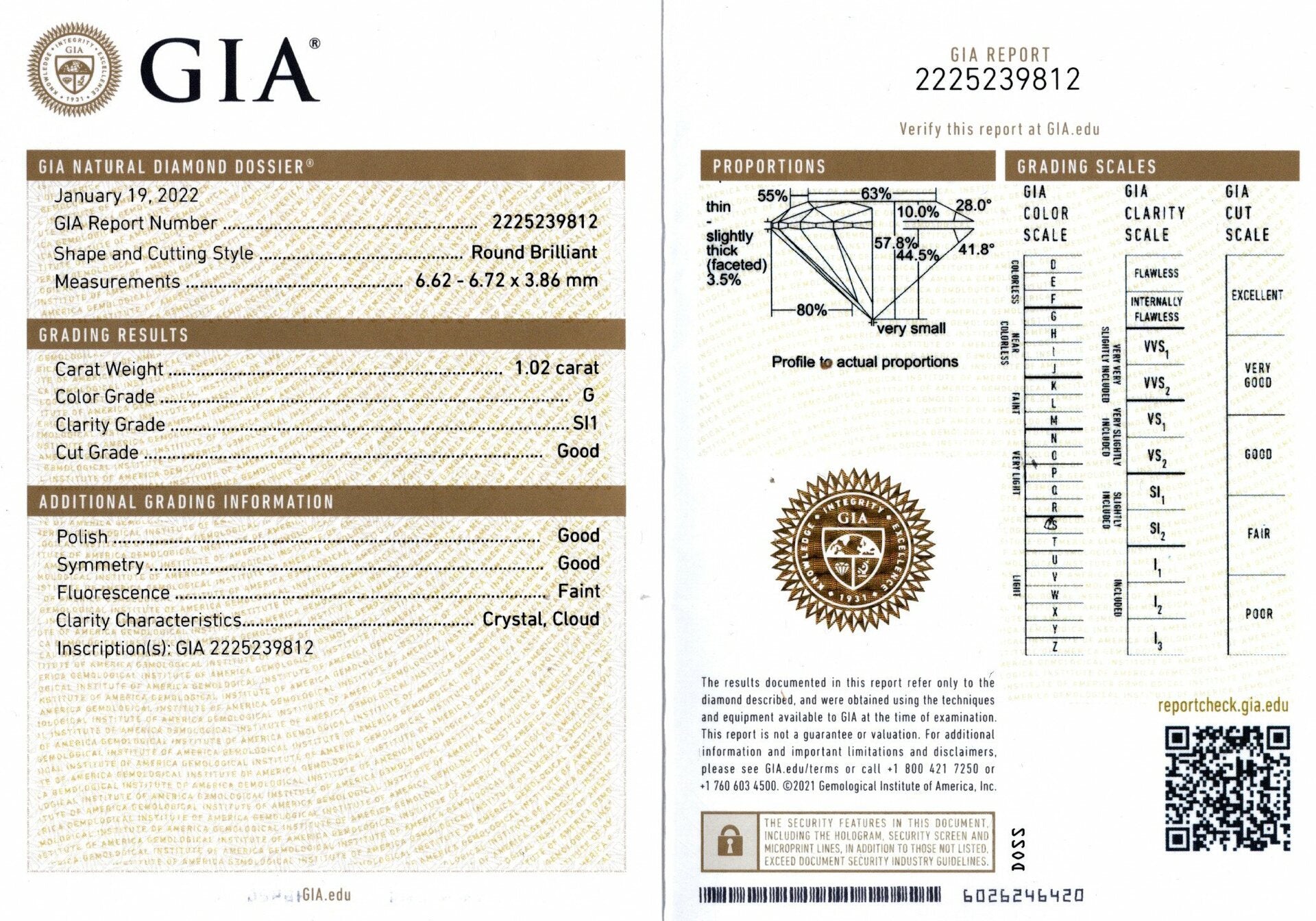 1 CARAT DIAMOND GIA CERTIFIED 6.6mm ROUND BRILLIANT CUT G SI1 NATURAL LOOSE 1ct