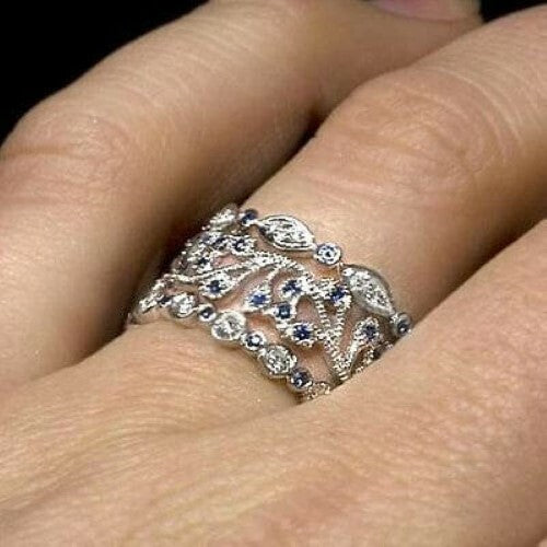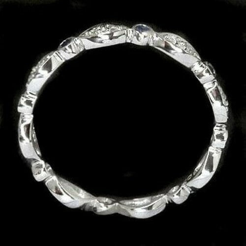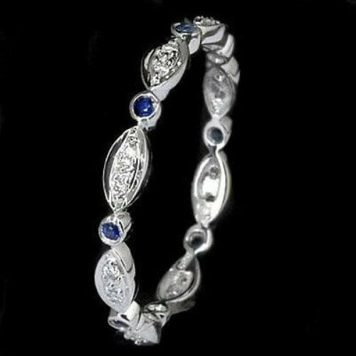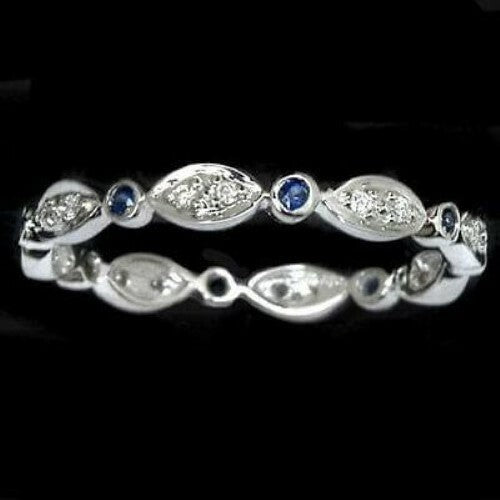 BLUE SAPPHIRE DIAMOND RING 14K WHITE GOLD DAINTY WEDDING BAND ETERNITY RING THIN