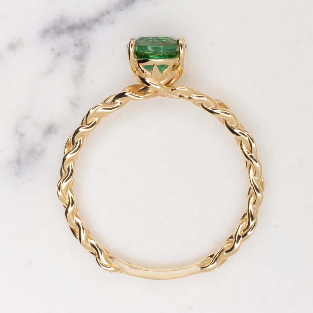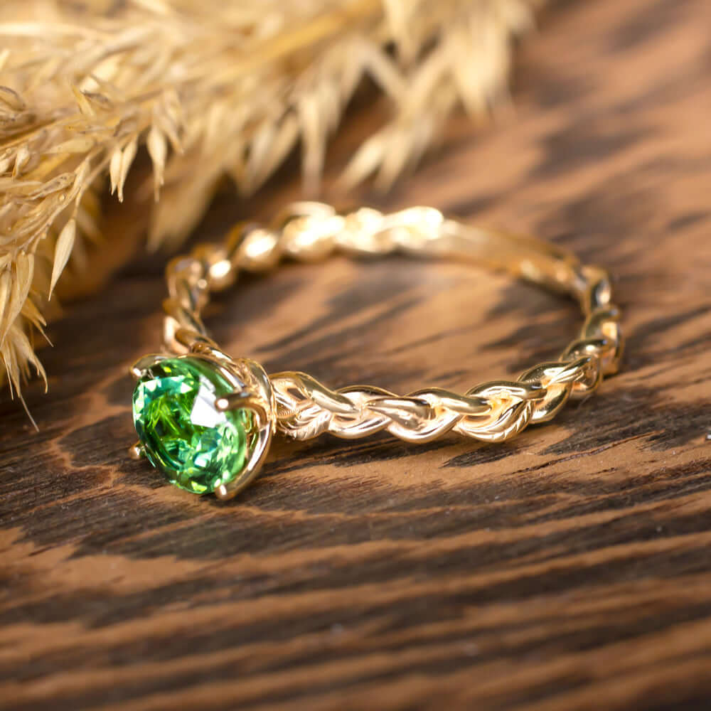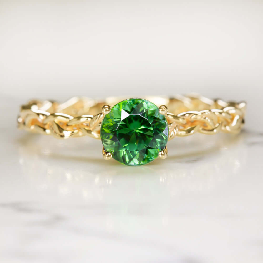 CHROME GREEN TOURMALINE 14K YELLOW GOLD RING VINE LEAF RUSTIC ORGANIC SOLITAIRE
