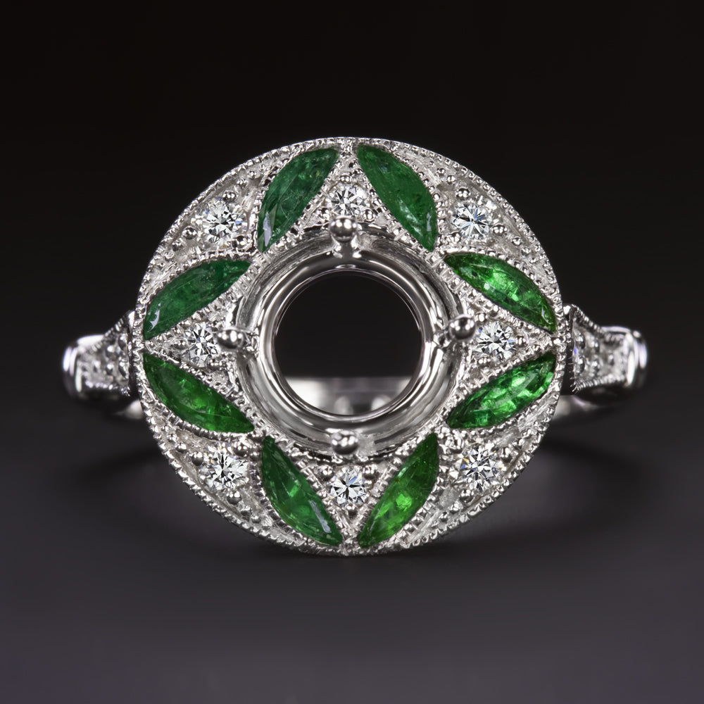 This diamond and emerald semi mount setting has an iconic Art deco design with a glittering diamond halo punctuated by spring green custom cut emeralds.