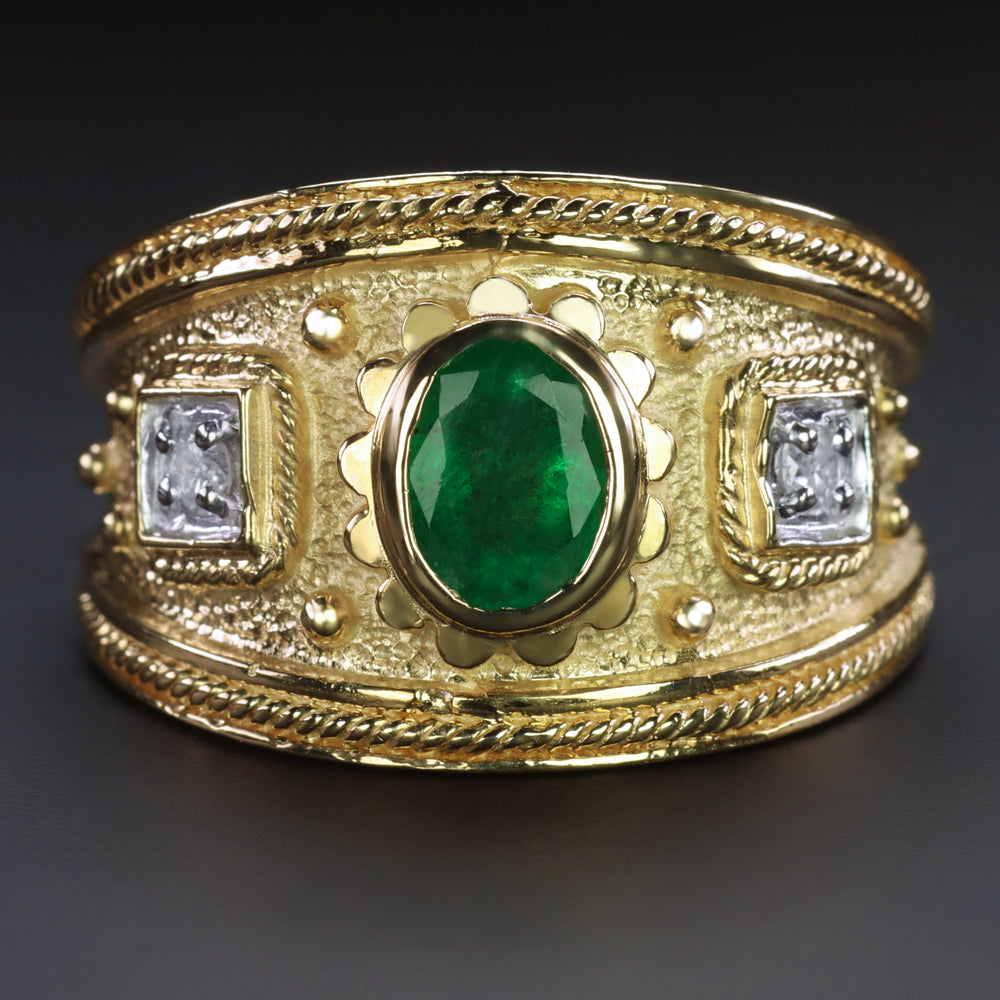 This vintage emerald and diamond ring has a bold and broad design featuring a natural emerald and two vibrant accent diamonds! It has a luxurious weight and a gorgeous impact!
