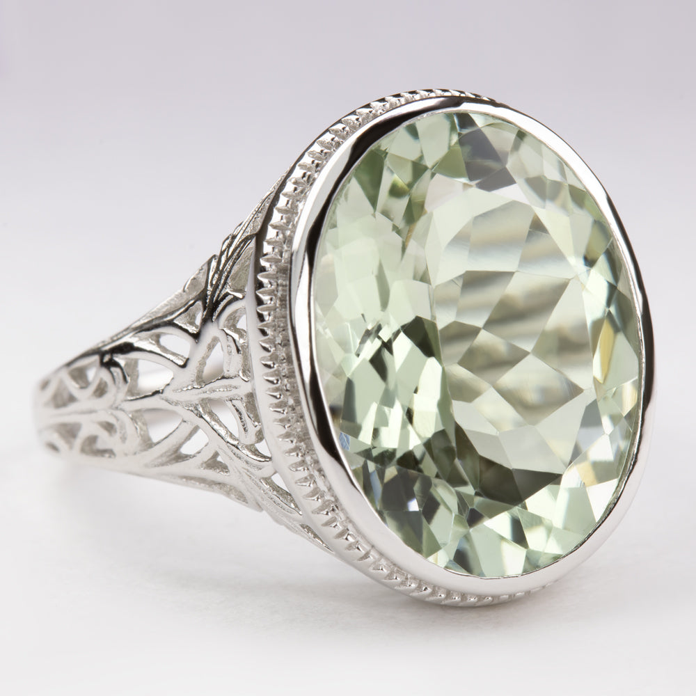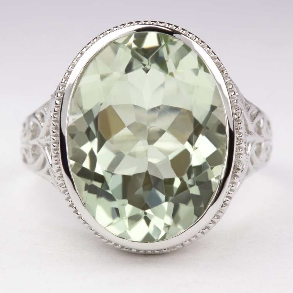 This vintage style ring features a prasiolite (green amethyst) set in a sterling silver setting. The Art Deco style setting is beautifully crafted with a bezel setting and curling filigree details. The oval prasiolite is a natural, earth mined stone. The ring measures 12.8mm across (north south) and 6mm from finger to top.