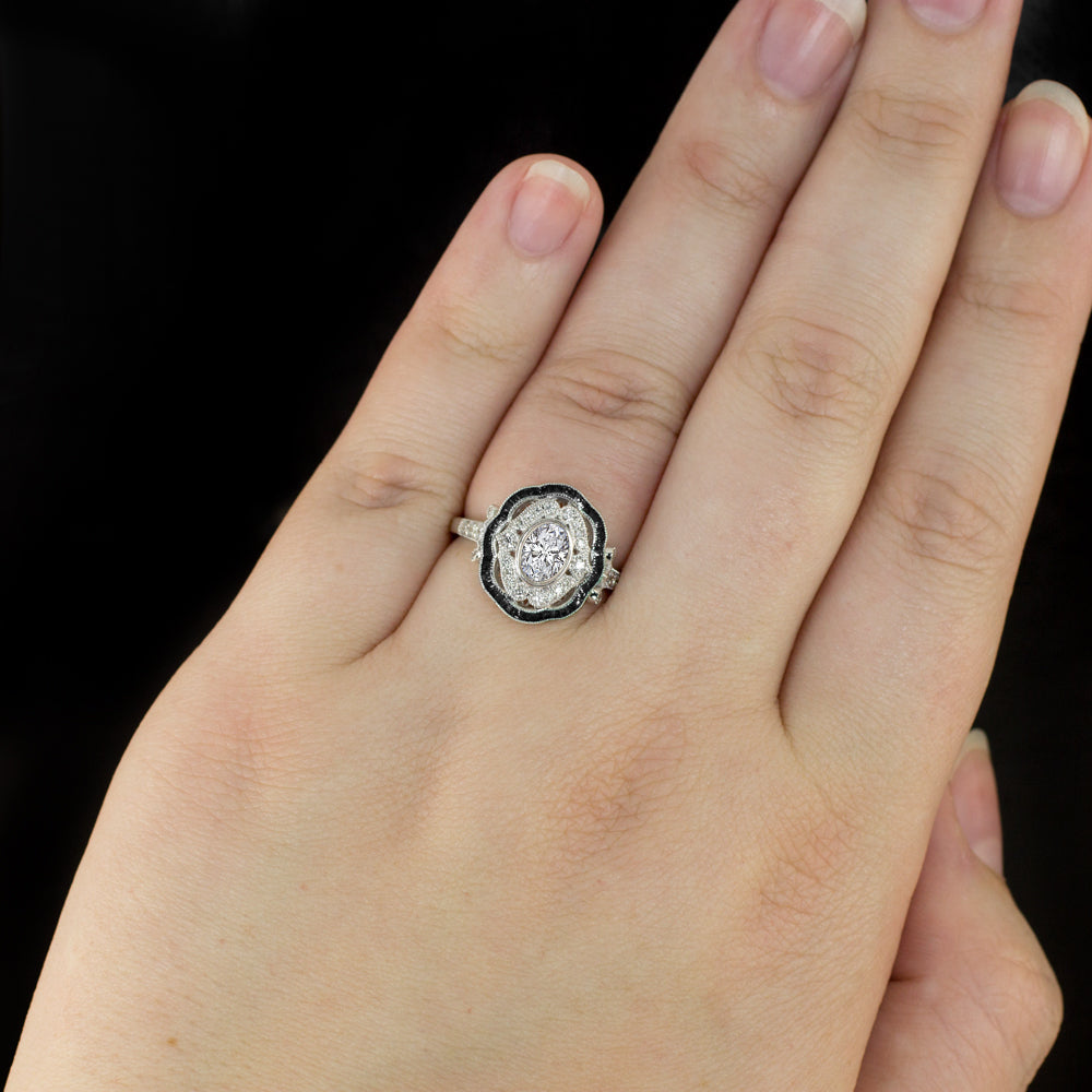 LAB CREATED DIAMOND ONYX COCKTAIL RING VINTAGE STYLE ART DECO 14k WHITE GOLD