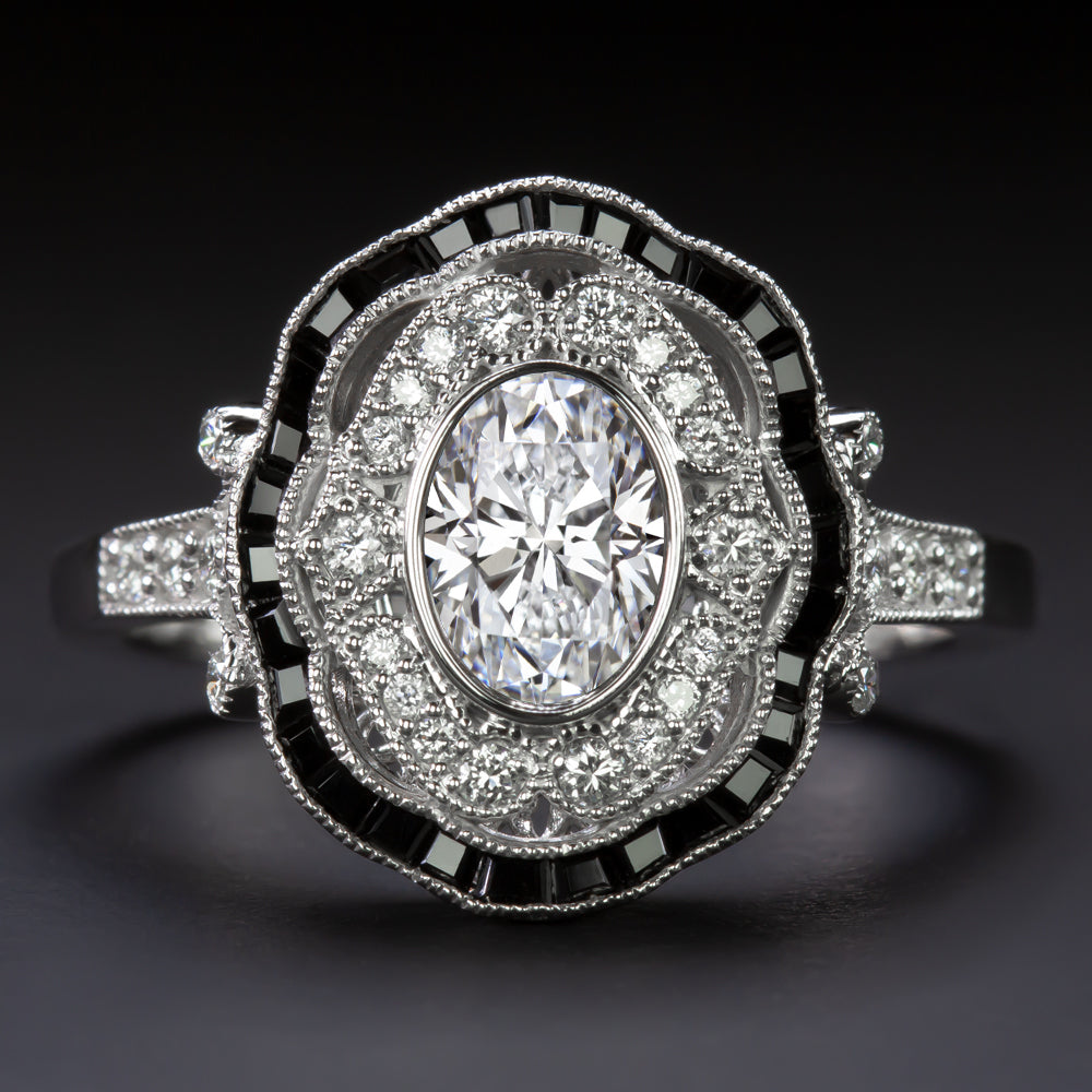 This lab grown diamond and onyx ring offers a stunning Art Deco style design, rich contrast, and gorgeous, substantial sparkle! The vibrant center stone is surrounded by brilliantly white and vibrant natural diamonds and encircled by an elegantly scalloped halo of custom cut black onyx.