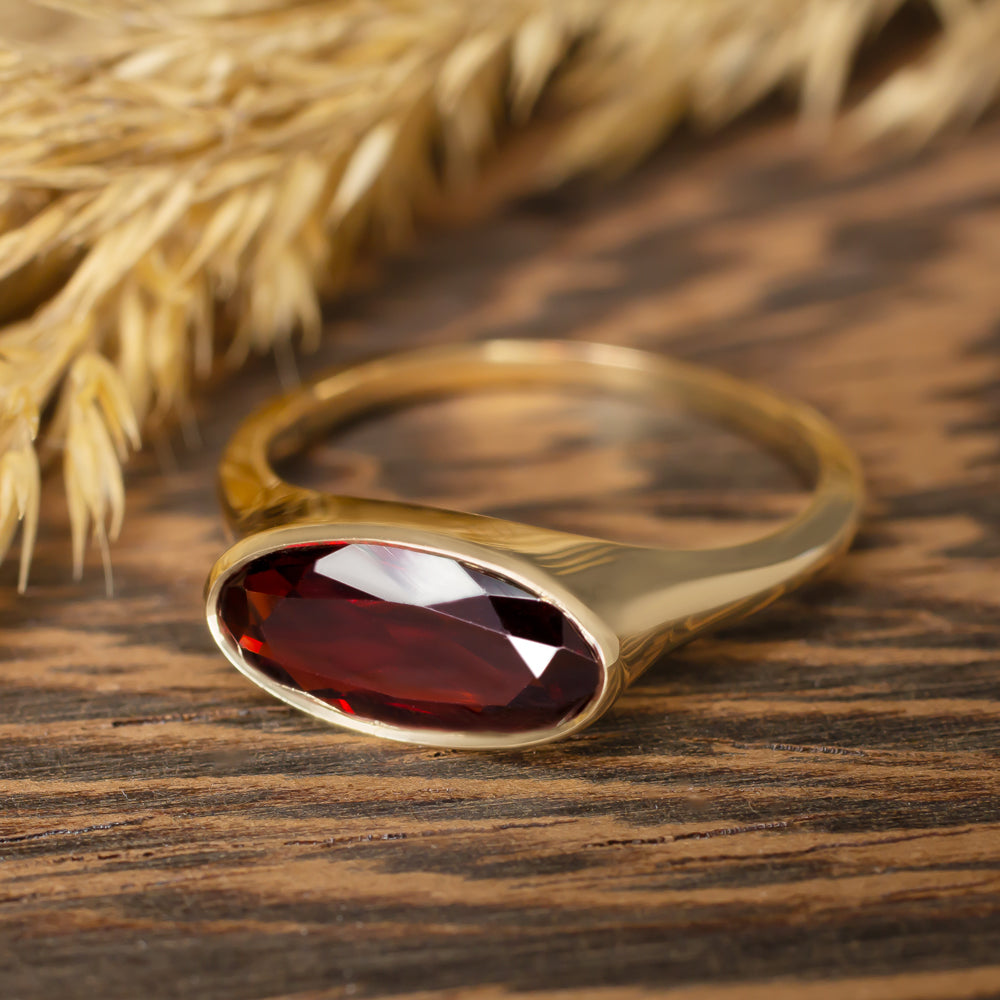 MOVAL RED GARNET 14K YELLOW GOLD RING EAST WEST BEZEL OVAL MARQUISE SOLITAIRE