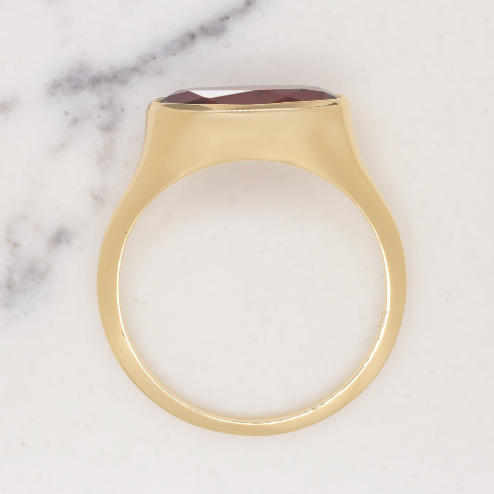 The garnet has a beautiful deep red hue. It is perfectly set off by the warmth of the gold. The The setting is solid 14k yellow gold and serves as an elegant backdrop for the garnet. The ring measures 6.9mm across (north south) and 4.4mm from finger to top.