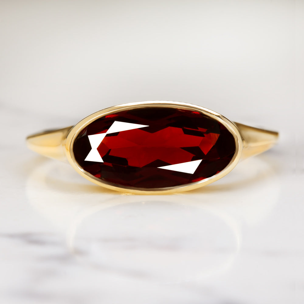 This beautiful and unique solitaire ring features a 2.19ct moval cut red garnet set in a sleek and elegant east west bezel setting! The garnet is a gorgeous rich red hue, and it has a beautiful play of light. The color is rich and luxurious, and it pairs perfectly with the yellow gold setting. The garnet’s elongated moval cut adds a unique touch. Combining aspects of the marquise cut and the oval cut, moval cuts are a rare find! The east west setting gives this classic ring a fashionable edge. A fully original piece, this ring was designed and crafted in our own Chicago shop. This beautiful garnet ring will add a chic touch to any outfit!