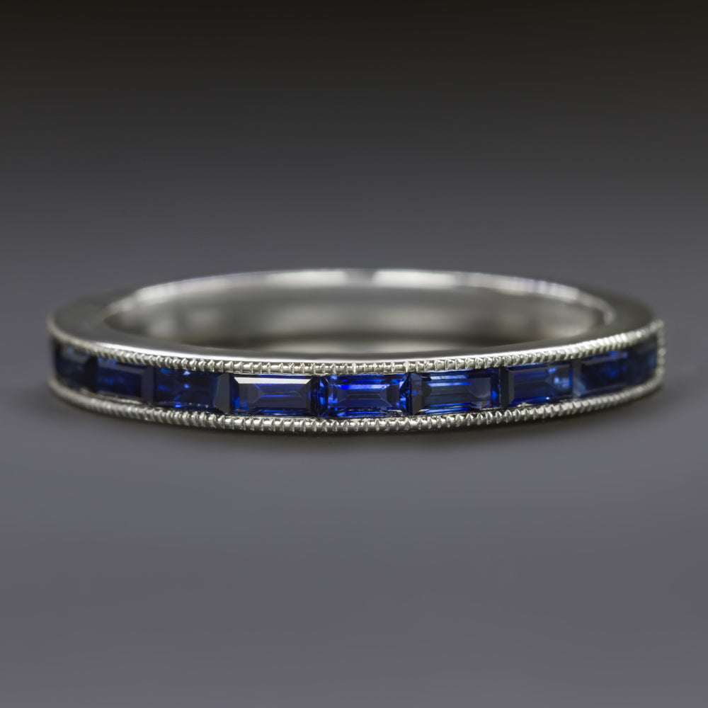 This sleek sapphire half eternity band has a sophisticated look with channel set sapphires set off by a milgrain accent!