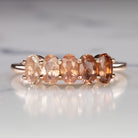 This gorgeous sunstone and 14k rose gold band is effortlessly elegant! The sunstones are a beautiful range of peach to rust hues. They are set in a beautiful gradient from light to dark for an elegant, one of a kind look. Finished with a sleek rose gold shank, this ring is modern and sophisticated yet stylish and sweetly feminine.