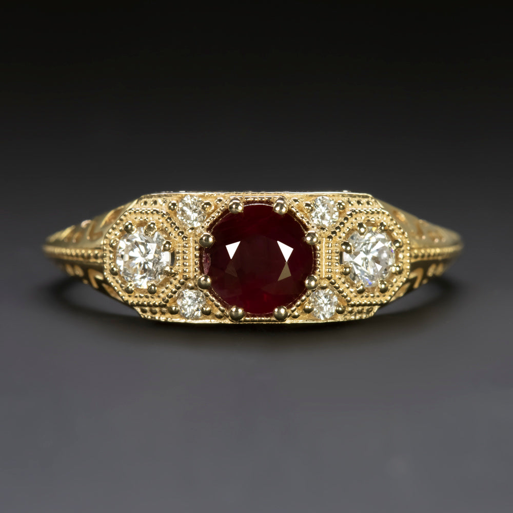 This striking vintage style ring features a rich red ruby in an elegant, diamond studded vintage style setting. The octagonal settings provide a geometric deco element complemented beautifully by the curves in the filigree and the romantic floral accents.