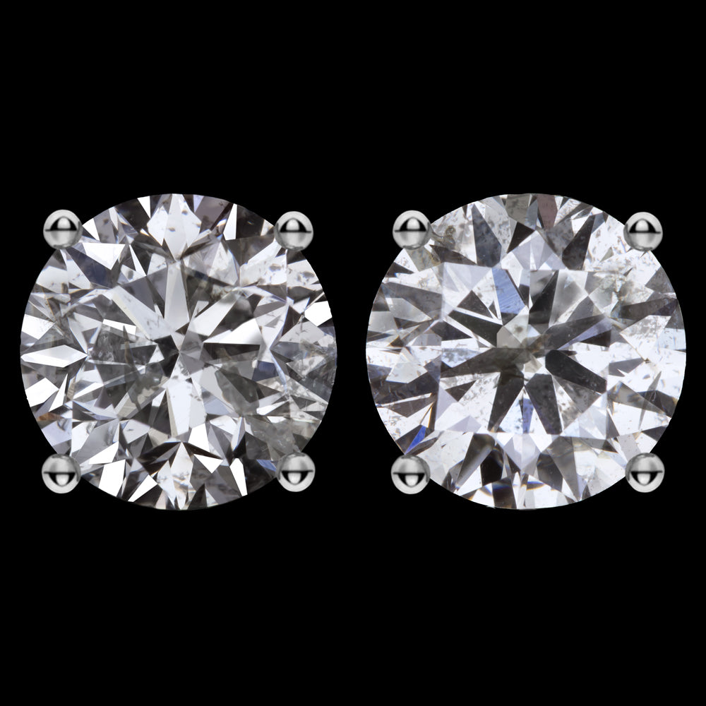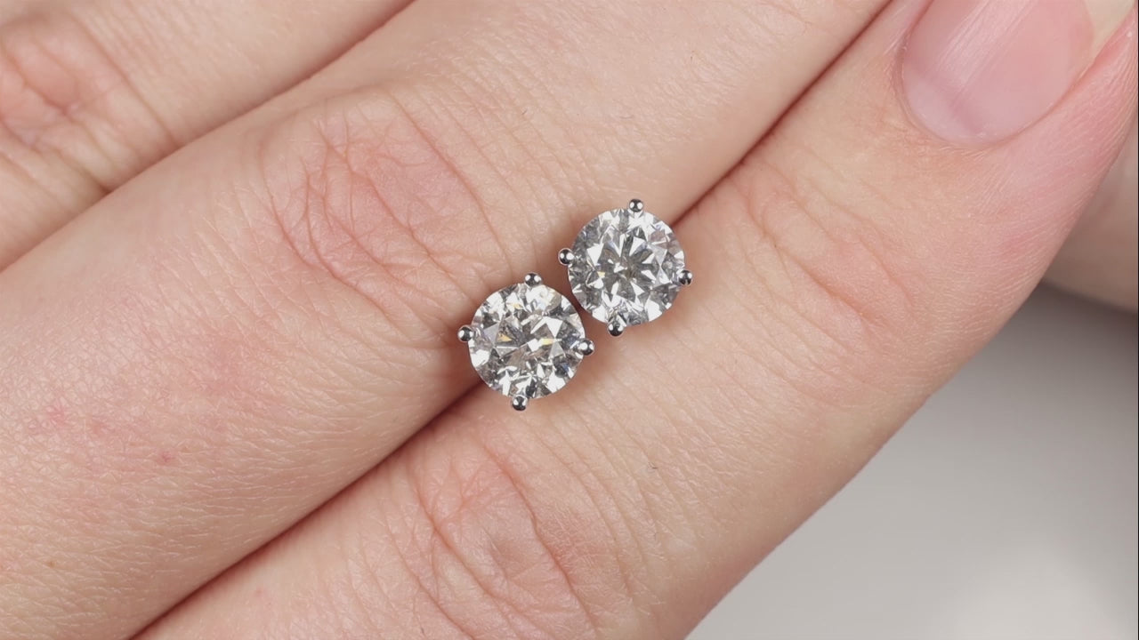 This eye catching 2.05ctw pair of round brilliant cut diamond stud earrings has bright white color, well hidden inclusions, and stunning sparkle! They are 100% natural earth mined diamonds and have not received any treatments or enhancements of any kind. Bright white, they are graded F-G for color, and they show absolutely no warmth. They are graded SI3-I1 for clarity and are quite close to eye clean. The inclusions blend in perfectly with the sparkle. In the ear, they will appear completely eye clean. The diamonds are exceptionally well cut, which maximizes their fiery liveliness. You will fall in love with their brilliance!