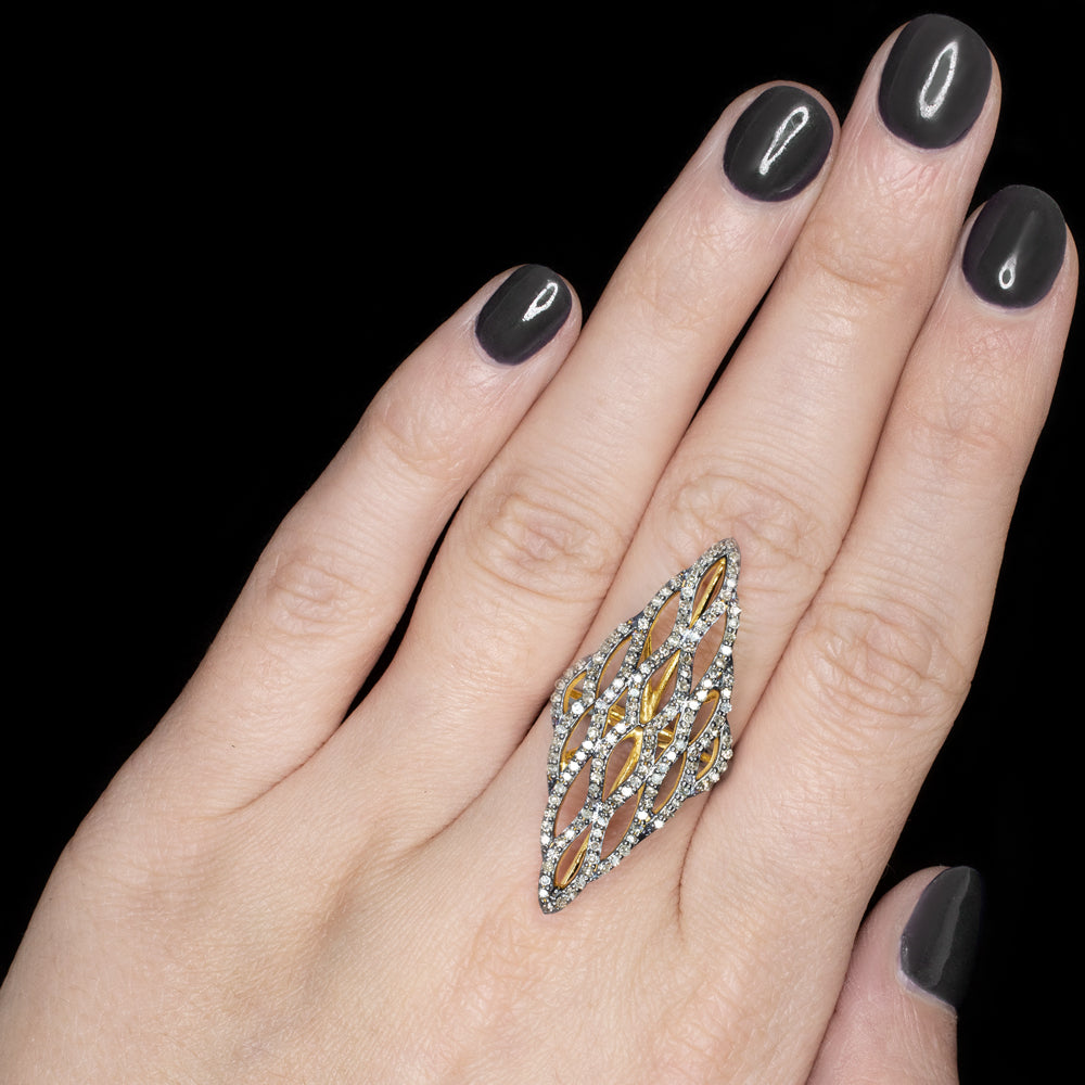 The diamonds are all natural and earth mined. The diamonds are graded VS2-I1 for clarity. The inclusions blend into the sea of sparkle, and the diamonds are bright and lively. The diamonds are graded K-M for color with a subtle champagne tint. They provide a gorgeous complement to the black rhodium finish and stand out brightly in contrast. Overall, the ring has a truly head-turning look! The ring is 925 sterling silver finished with black rhodium on the top of the setting and the outside of the shank. The black rhodium finish creates a stunning contrast with the bright sparkle of the diamonds. The inside of the shank and the undergallery is finished with 24k yellow gold for a luxurious pop of color. The ring is completely made by hand from metal forming to stone setting and is quite labor intensive to create. It has a charming, handmade artisan quality combined with the luxury of diamonds. The ring measures 1.5in across north south and 8.9mm from finger to top.