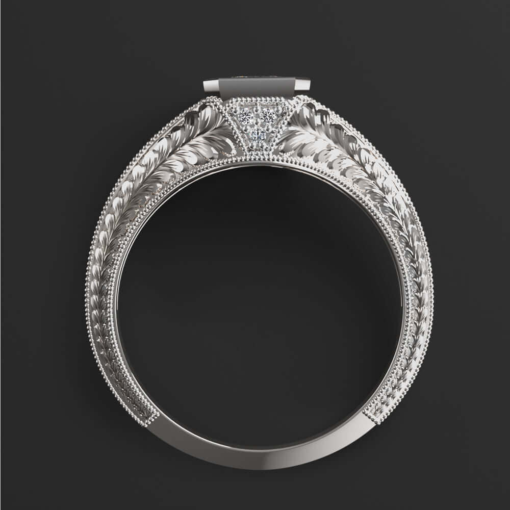 This diamond ring features a sleek 1.5 carat emerald cut diamond paired with a vintage style setting with diamond studded shoulders and romantic engraved details.