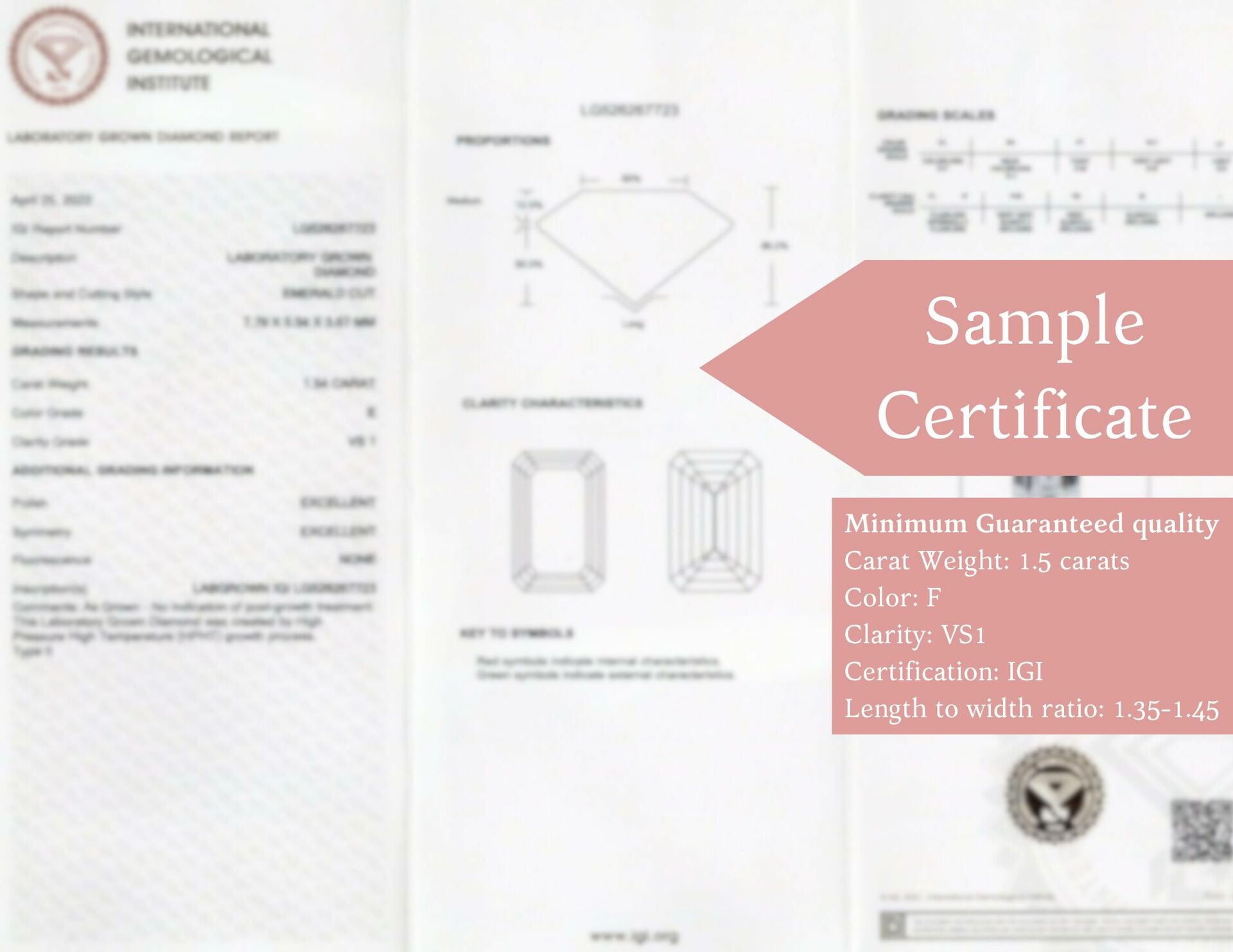 **This ring is made to order with our current offering for 1.5 carat emerald cut lab grown diamonds. This listing reflects minimum guaranteed quality. The stone you receive will be the listed quality or better on all stats (carat weight, color, clarity, cut).