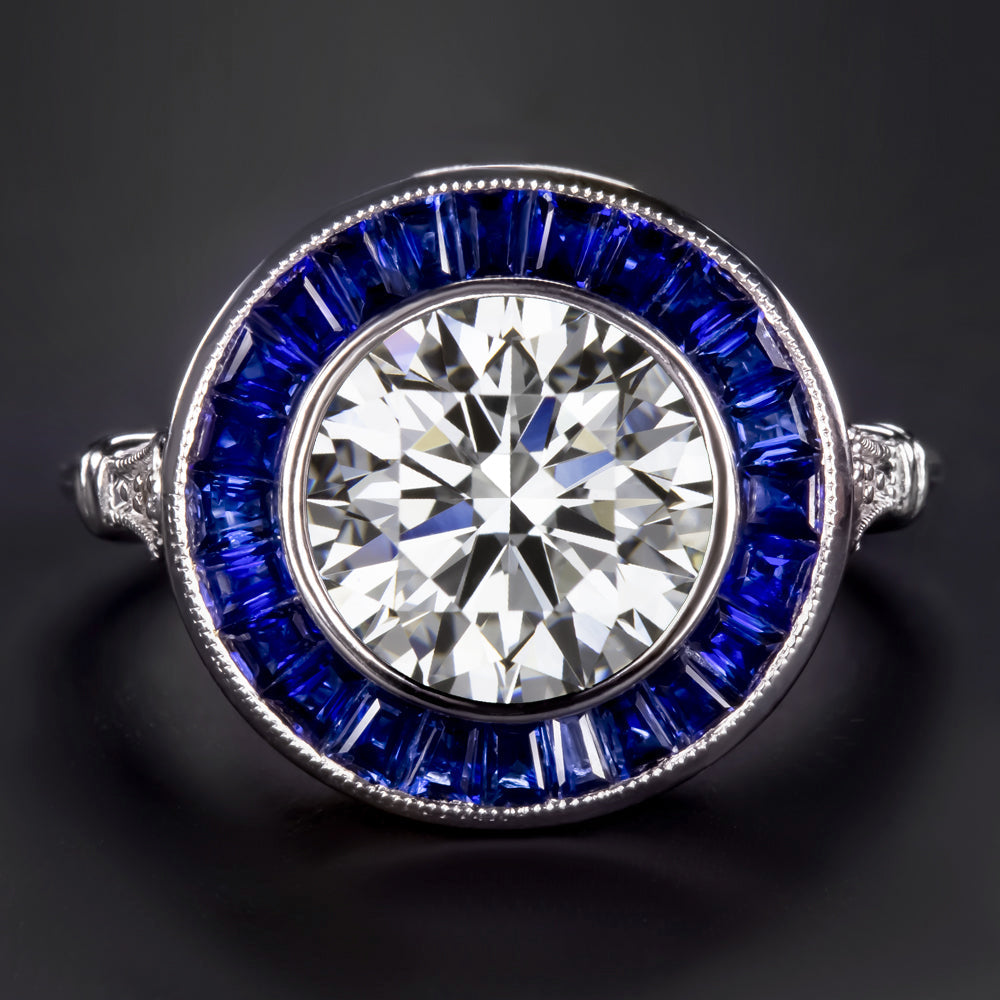 This lab grown diamond and sapphire ring has a classic Art Deco style target design! It offers rich color and gorgeous, substantial sparkle! It is an excellent choice for an engagement or cocktail ring.
