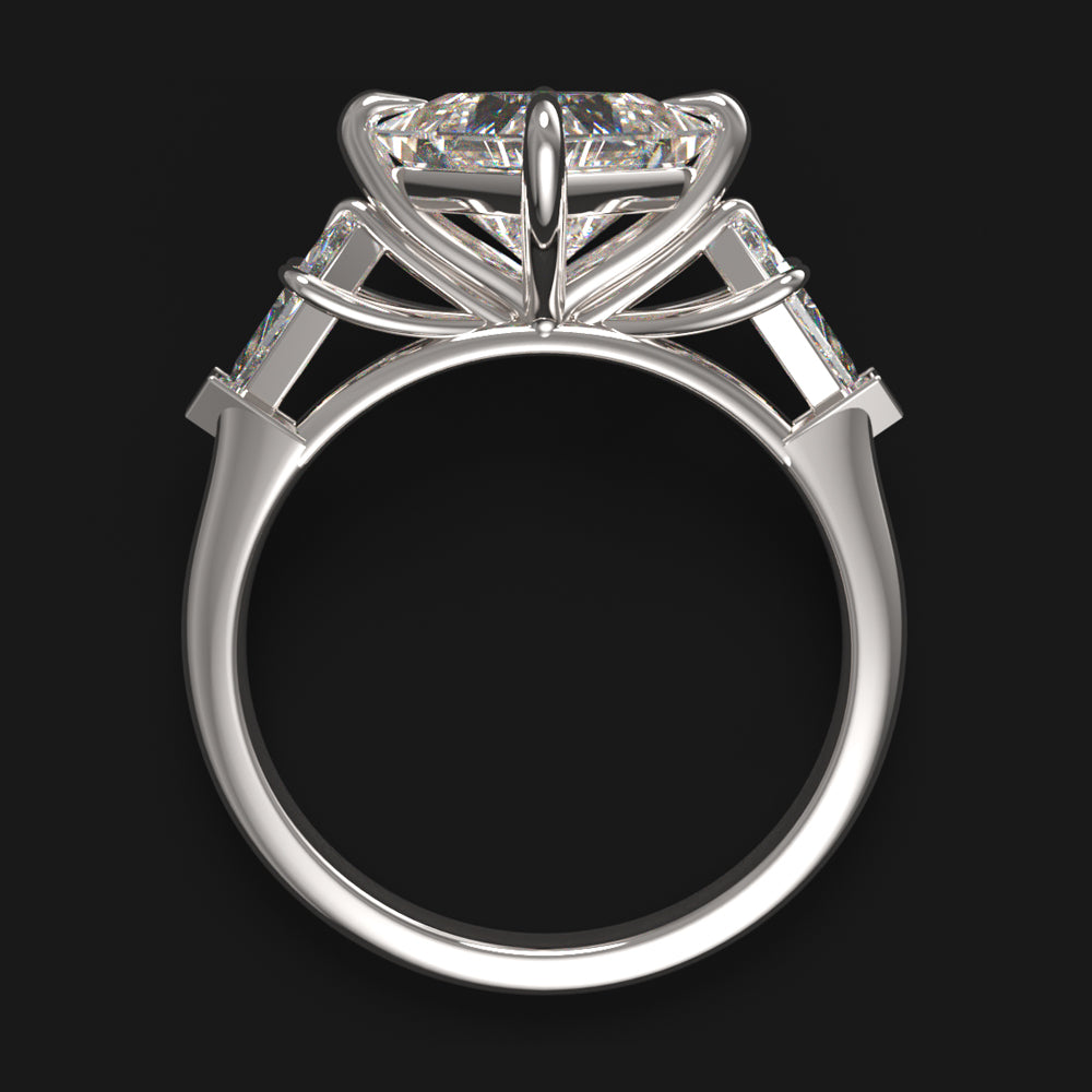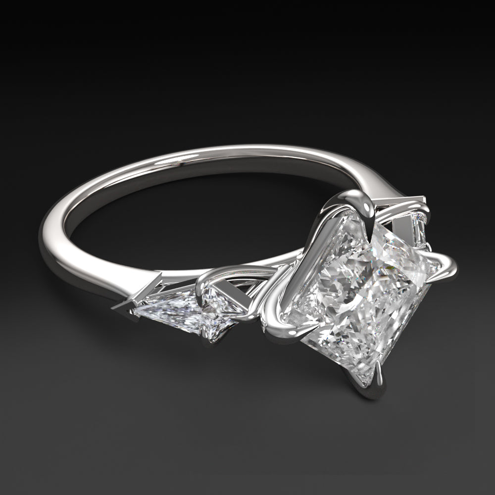 This three stone engagement ring is classic with a twist, featuring a substantial 2 carat lab grown diamond flanked by glittering kite shape accent stones. It has an air of timeless sophistication that will stay forever in style!