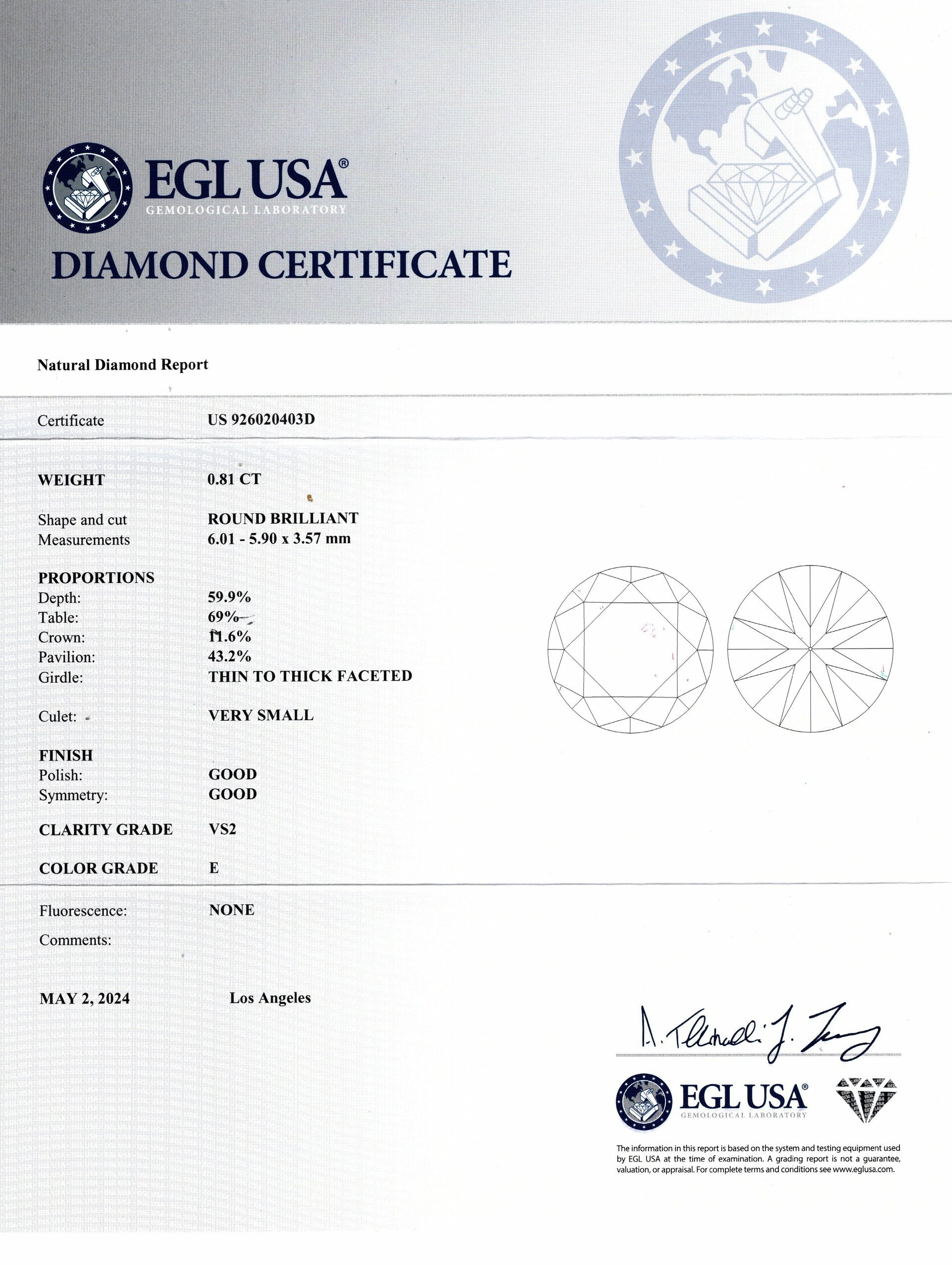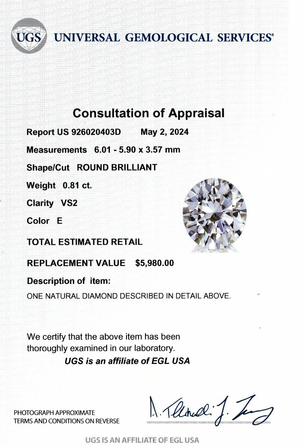 0.81ct LOOSE DIAMOND CERTIFIED E VS2 ROUND BRILLIANT CUT NATURAL COLORLESS RBC