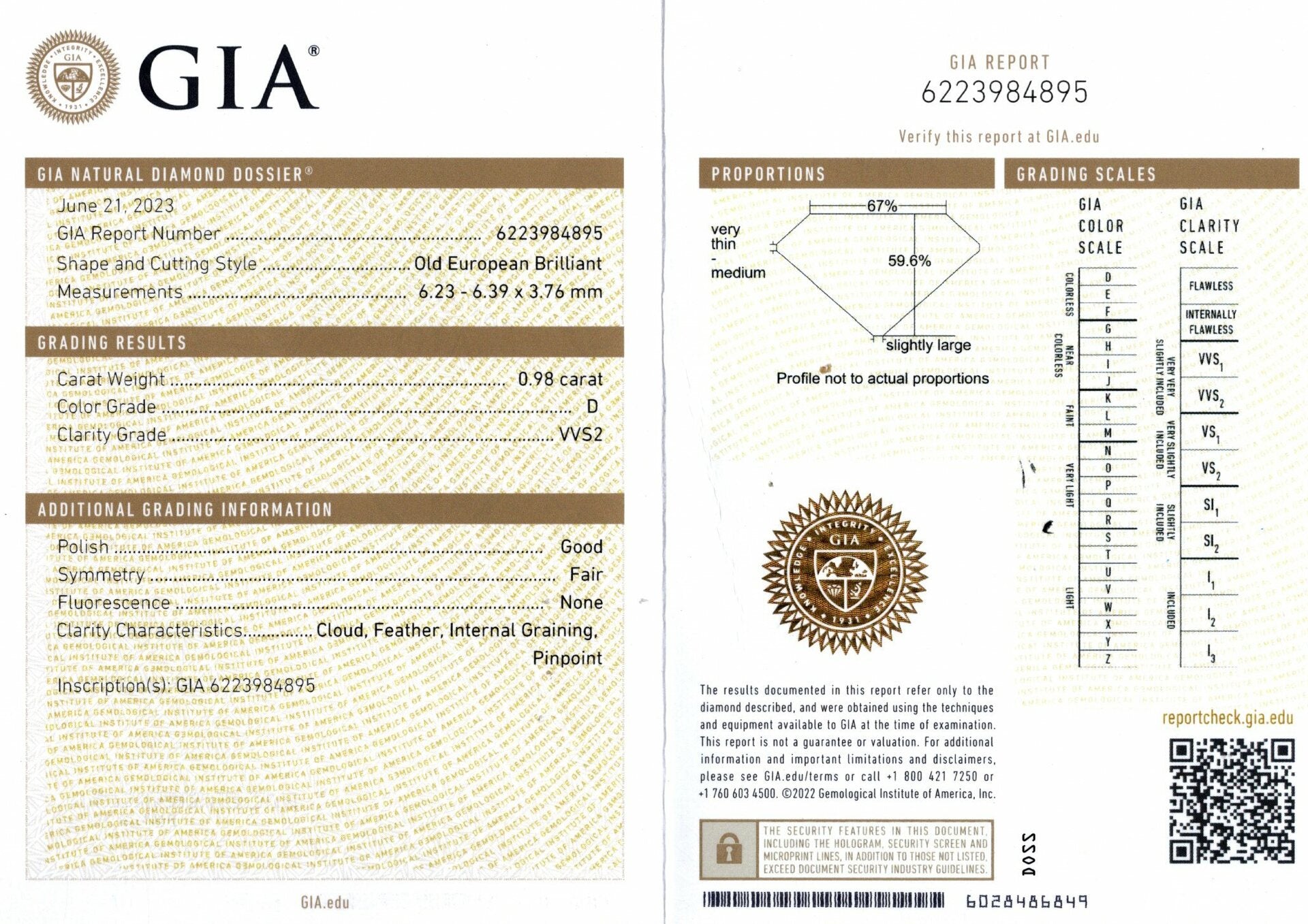 0.98ct D VVS2 OLD EUROPEAN CUT DIAMOND GIA CERTIFIED VINTAGE LOOSE NATURAL 1ct