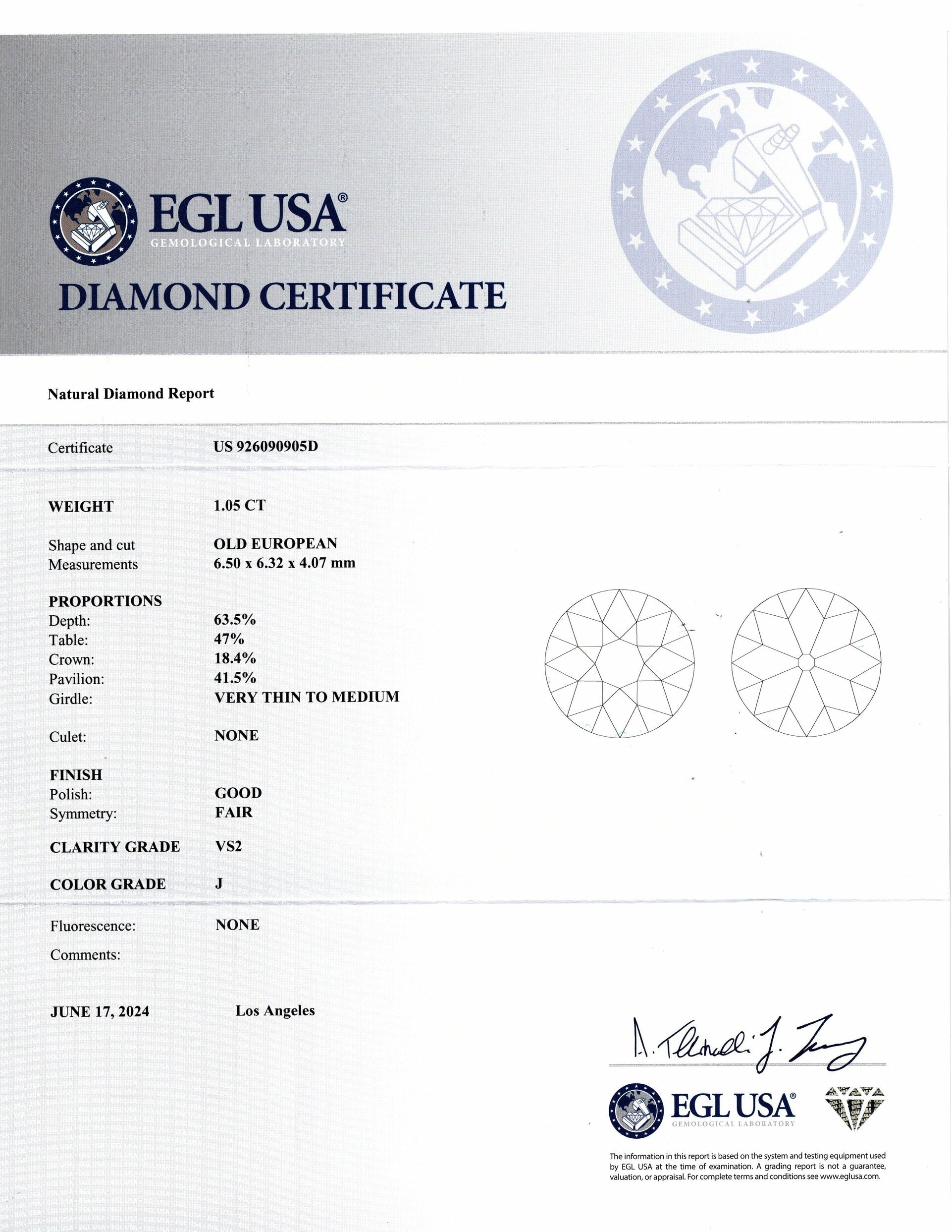 1.05ct OLD EUROPEAN CUT DIAMOND CERTIFIED J VS2 VINTAGE LOOSE NATURAL ESTATE 1ct
