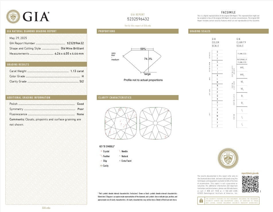 1.13ct ANTIQUE OLD MINE CUT DIAMOND GIA CERTIFIED H SI2 CUSHION BRILLIANT LOOSE