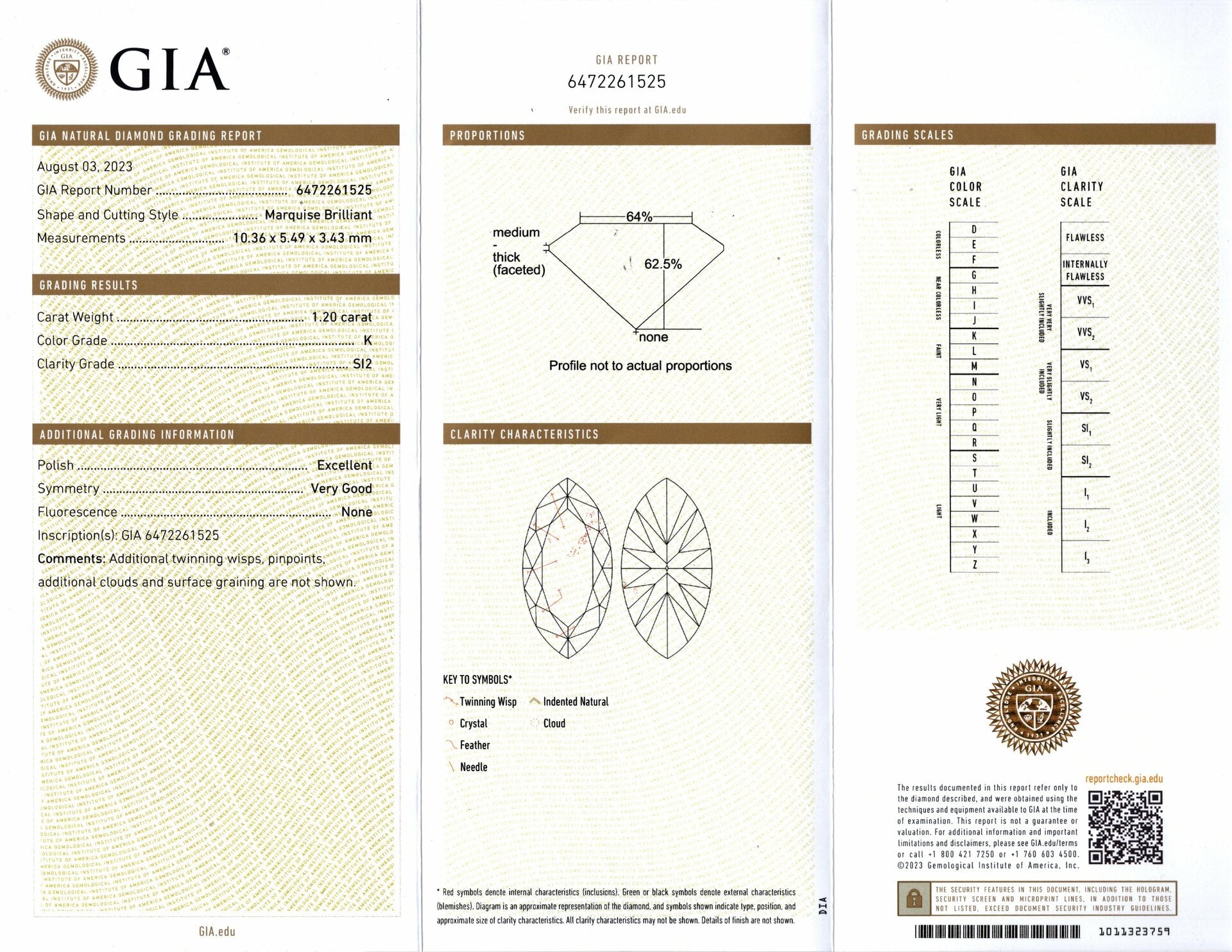 1.20ct MARQUISE SHAPE CUT DIAMOND GIA CERTIFIED K SI2 LOOSE NATURAL ENGAGEMENT