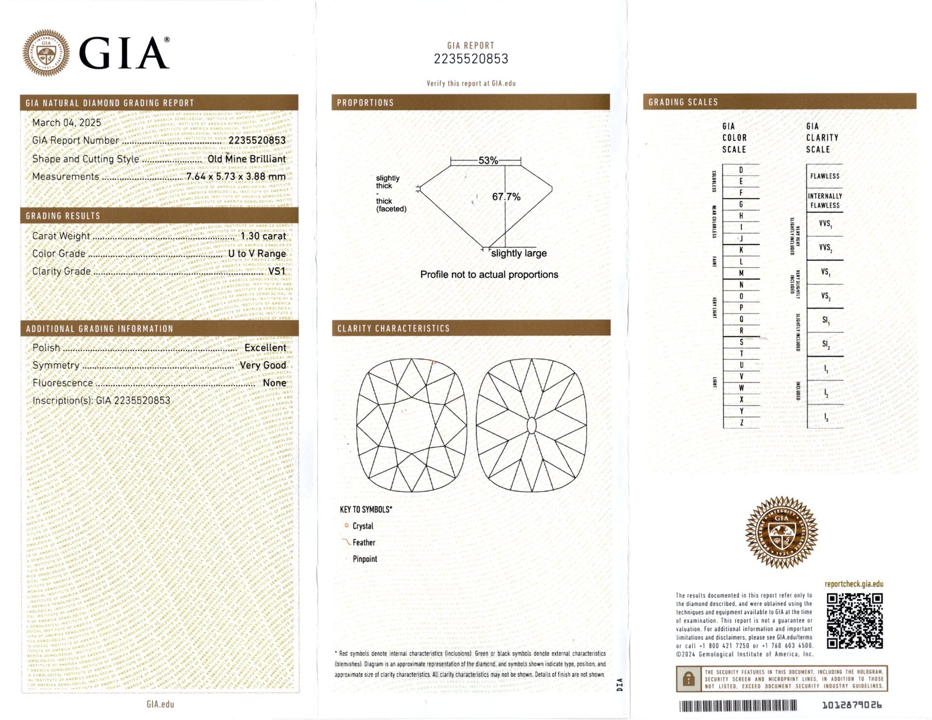 1.30ct OLD MINE CUT DIAMOND GIA CERTIFIED U-V VS1 ELONGATED CUSHION BRILLIANT