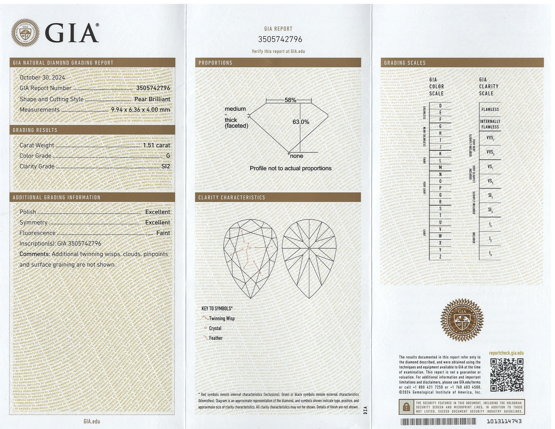 1.5 CARAT PEAR SHAPE DIAMOND GIA CERTIFIED G SI2 TEARDROP CUT LOOSE NATURAL