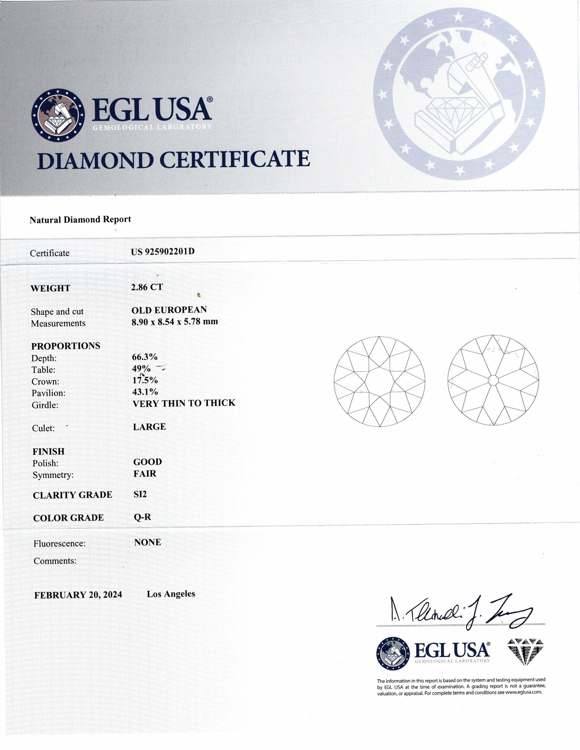 2.86ct OLD EUROPEAN CUT DIAMOND CERTIFIED Q-R SI2 VINTAGE LOOSE NATURAL ESTATE
