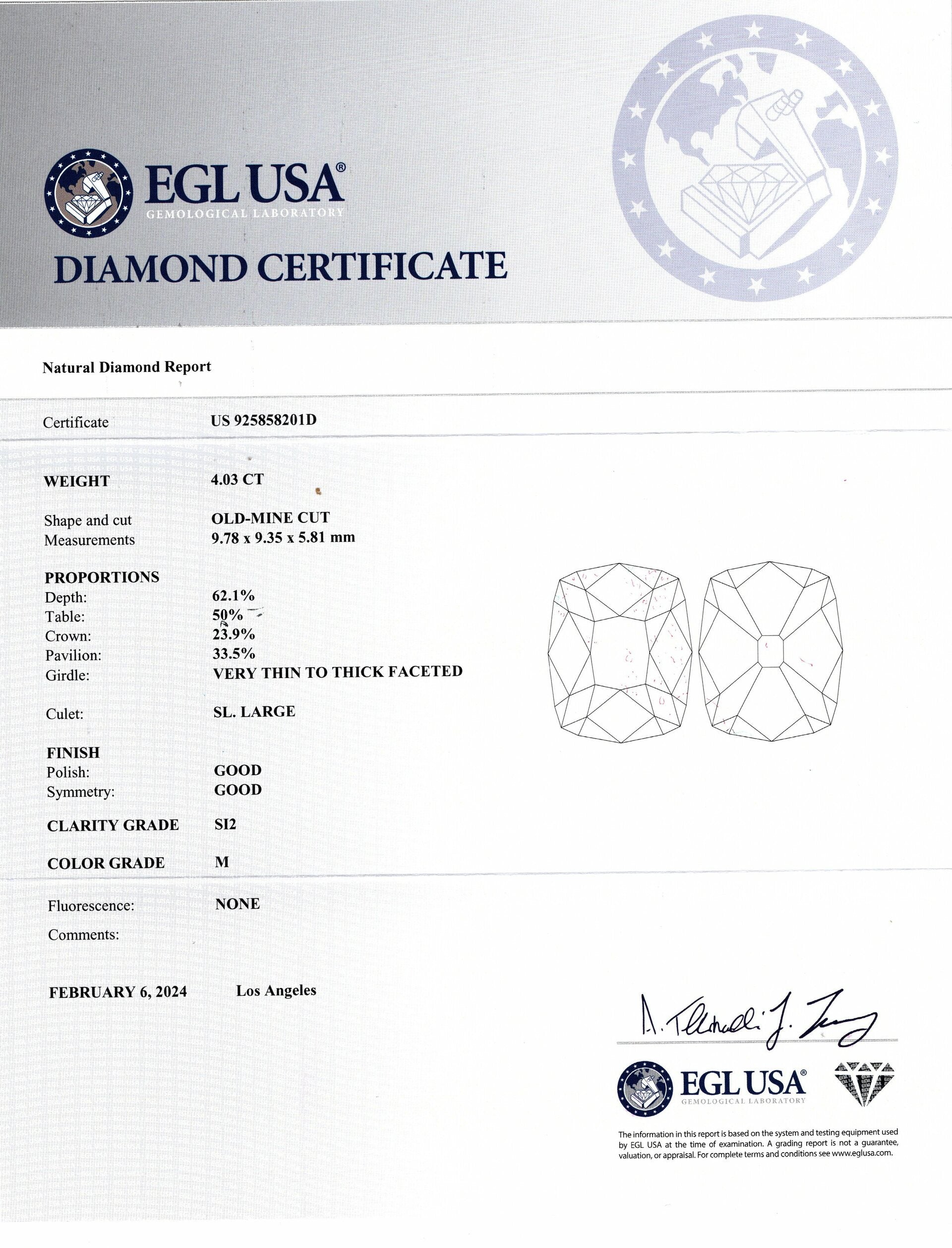 4 CARAT OLD MINE CUT DIAMOND CERTIFIED M SI2 LOOSE NATURAL ANTIQUE CUSHION 4ct