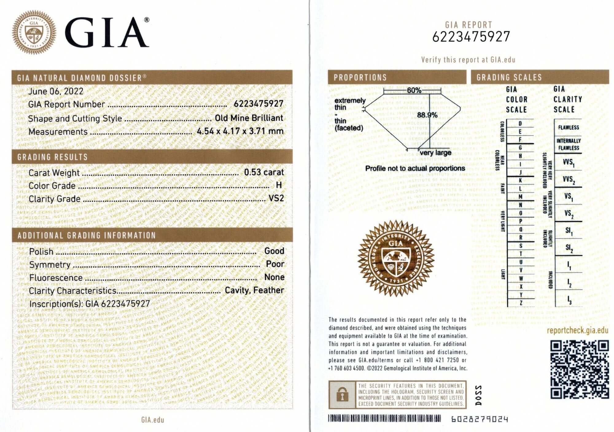 The 0.53ct diamond is certified by GIA, the world’s premier gemological authority. Under GIA’s rigorous standards, the diamond received a grade of H for color. This is a truly old diamond, which is difficult to find one that faces up white. Graded VS2 for clarity and is totally eye clean. Completely eye clean, it is difficult to find any inclusions under 10x magnification! This is a particularly important point for old cut diamonds as they tend to be less forgiving when it comes to inclusions. With its bright and eye-catching sparkle as well as its historied provenance, this diamond truly has a singular presence!