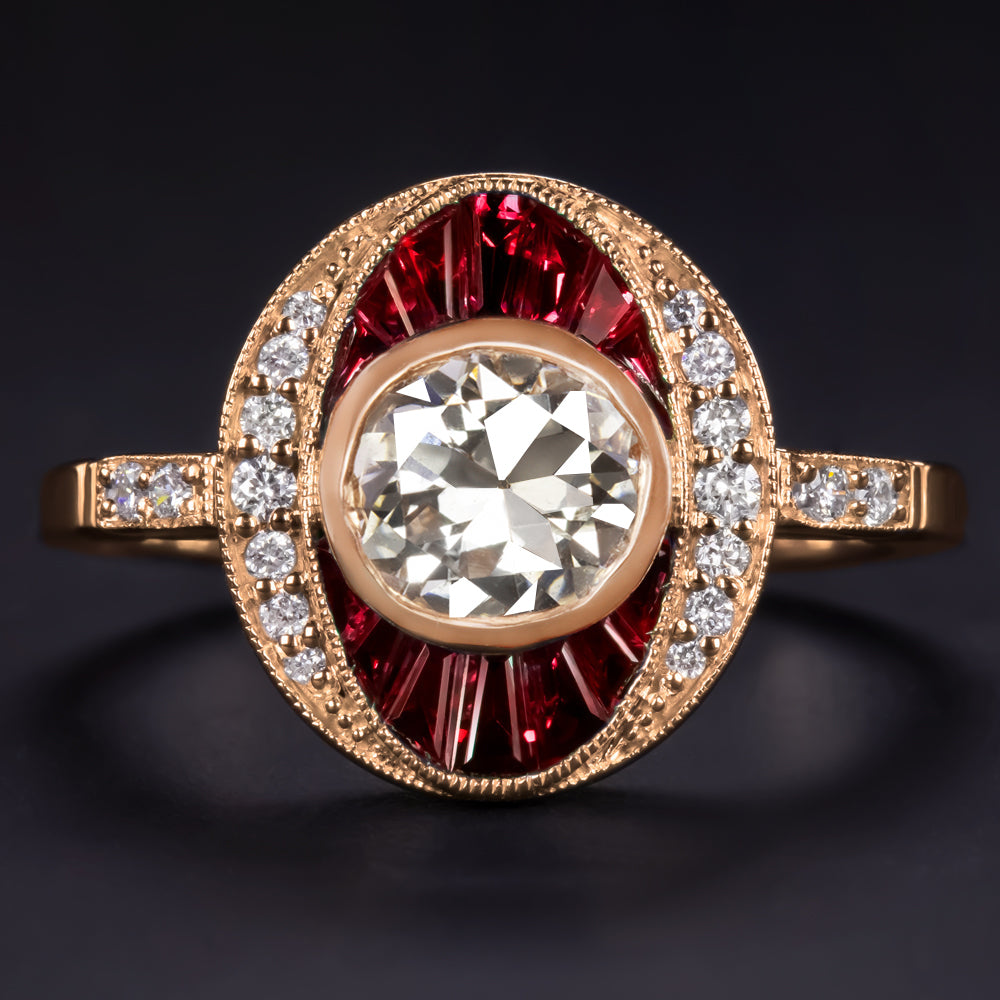 This diamond and ruby ring offers a stunning Art Deco style design, rich color, and gorgeous, substantial sparkle! Featuring an 0.91ct old European cut diamond, the ring has a beautifully crafted oval design set with brilliantly white and vibrant natural diamonds as well as rich red custom cut natural rubies.