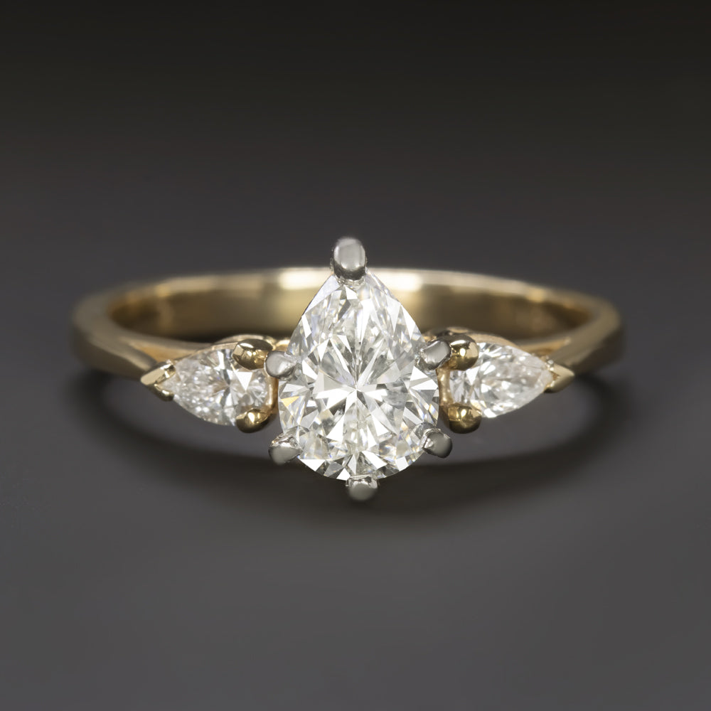 This classic engagement ring has a time tested three stone design! It features a high quality 1.00ct pear cut diamond flanked by pear shape diamonds for a sleek and glamorous look!