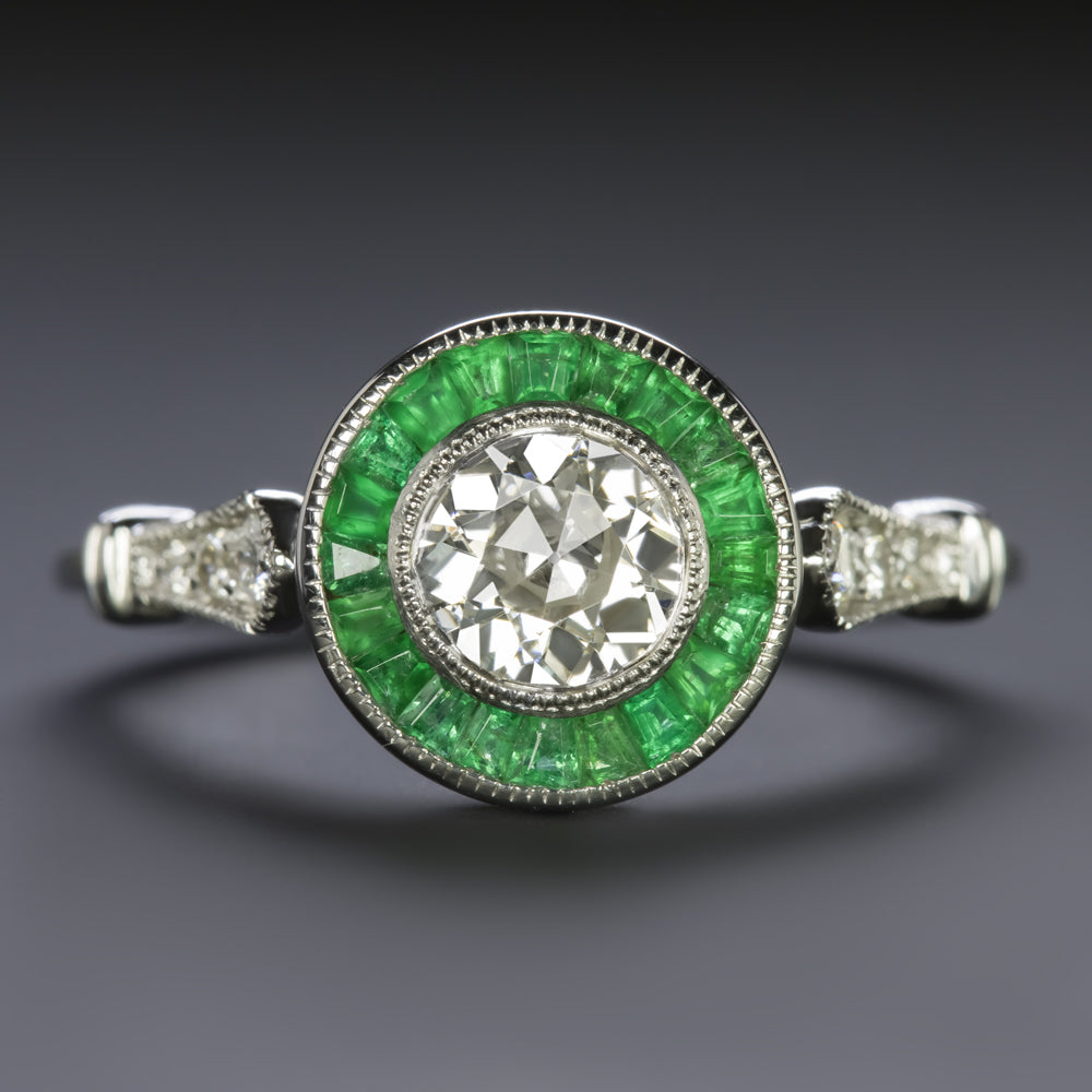 This diamond and emerald ring has a classic Art Deco style target design and features a gorgeous original vintage diamond! It is an excellent choice for an engagement or cocktail ring.