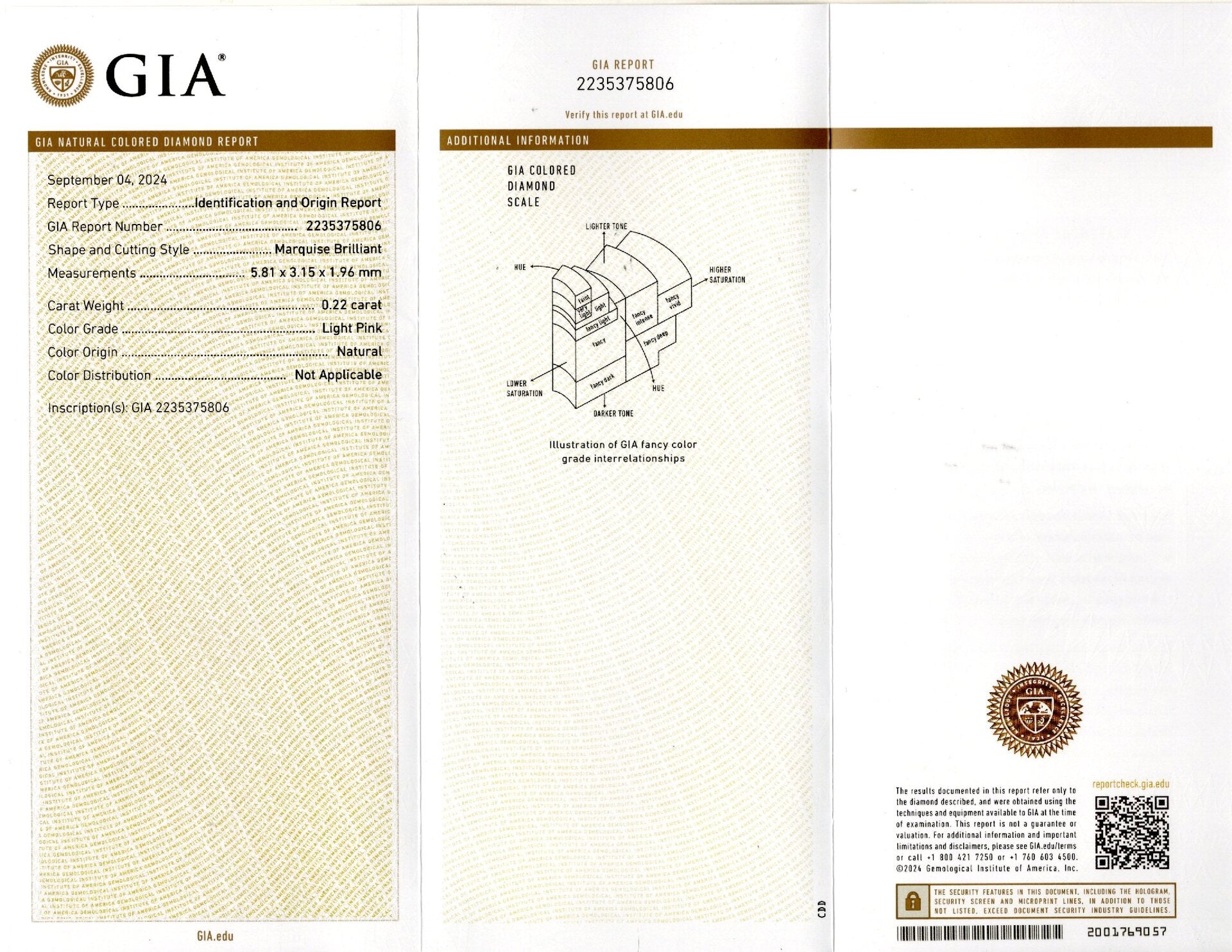 0.22ct LIGHT PINK DIAMOND GIA CERTIFIED NATURAL MARQUISE SHAPE CUT LOOSE STONE