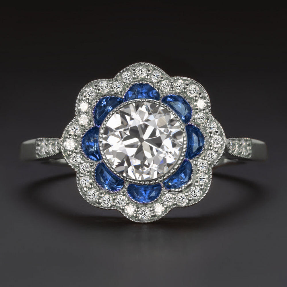 This gorgeous diamond and sapphire halo ring has a charming flower shape and elegant vintage style touches!