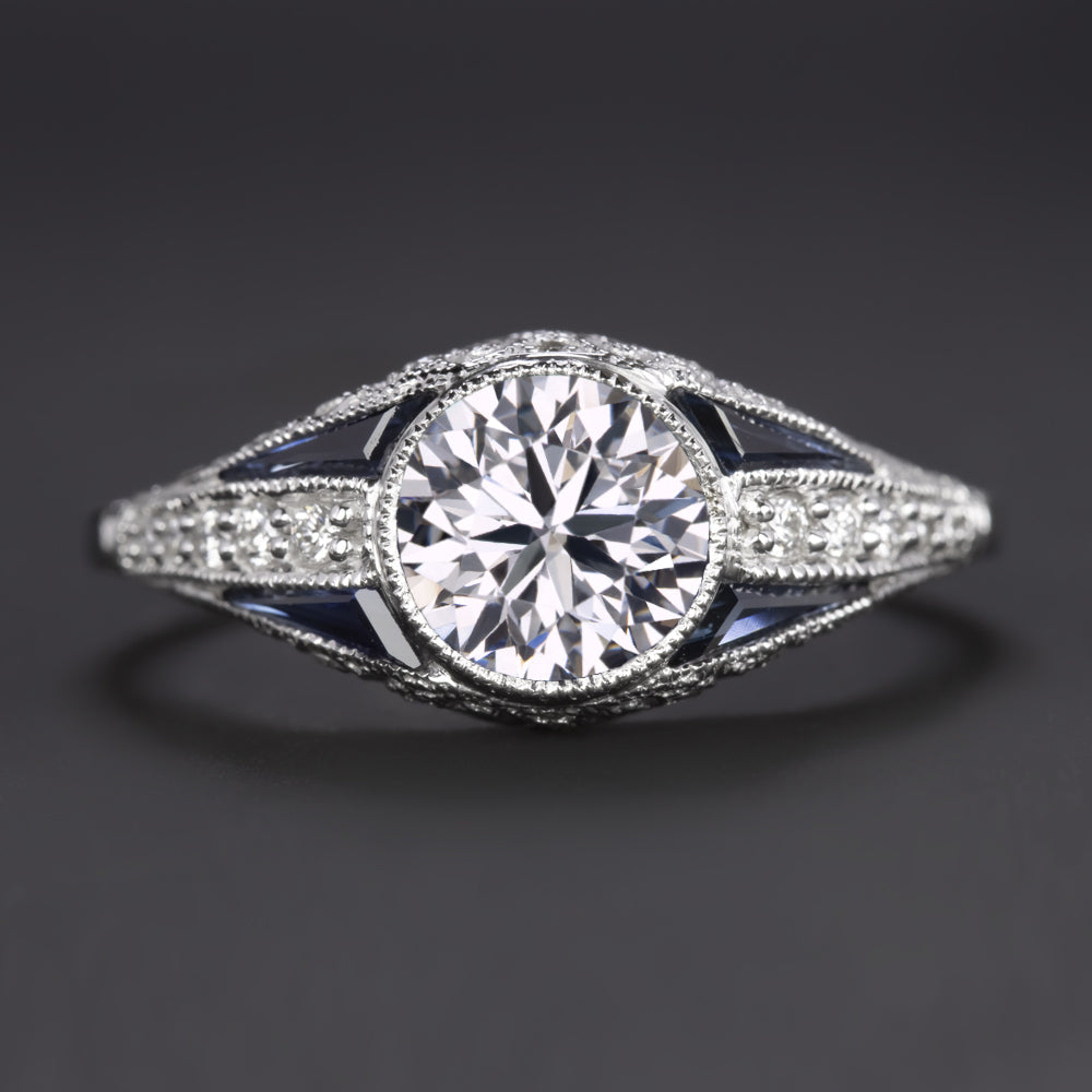 This gorgeous diamond and sapphire ring features a very high quality 0.90ct round brilliant cut diamond set at the center of an elegant Art Deco style design. The bright white and completely eye clean diamond is accented by rich blue triangles of calibre cut sapphires and vibrant diamonds.
