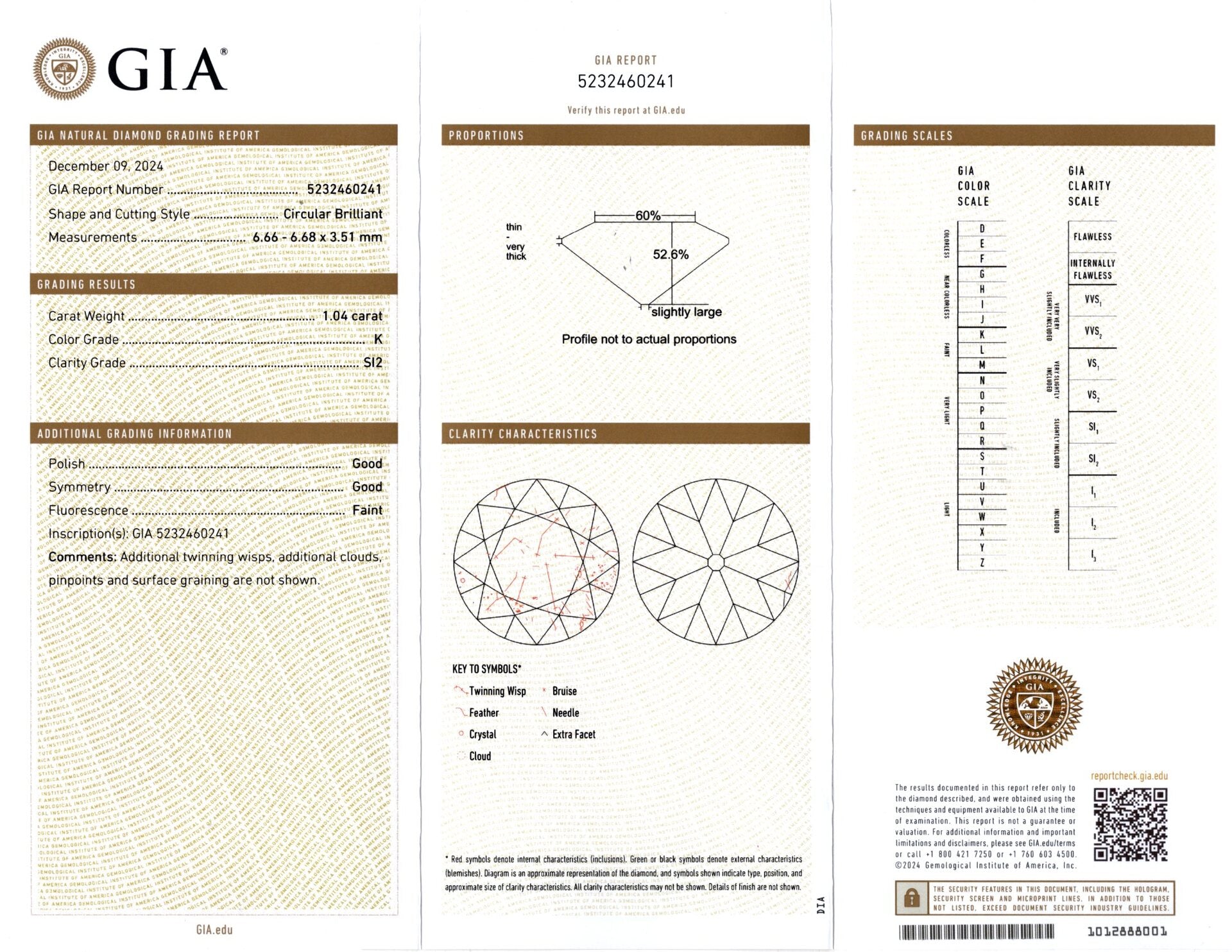 1.04ct OLD EUROPEAN CUT DIAMOND GIA CERTIFIED K SI2 LOOSE NATURAL VINTAGE 1ct
