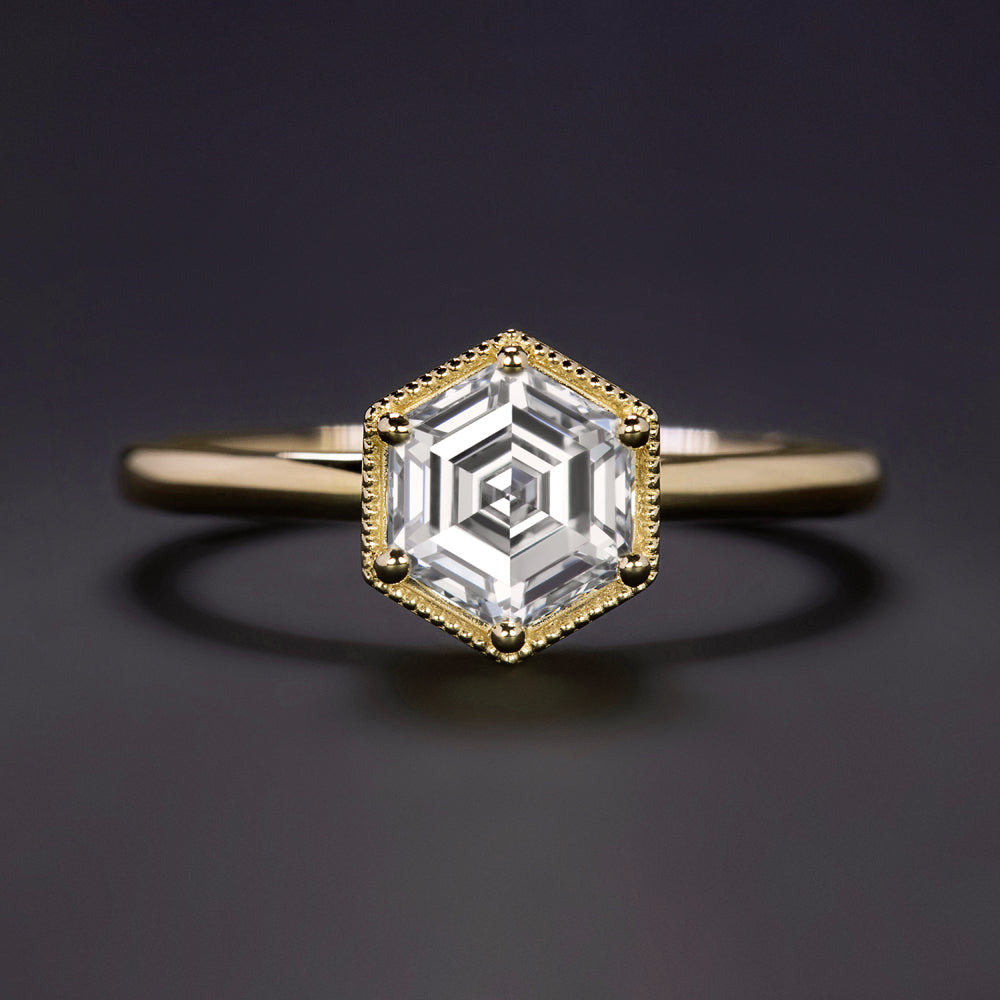 This striking lab diamond ring features a sleek hexagon shape 1.05ct lab grown diamond in a classic solitaire setting with milgrain accents. It’s a modern twist on a timeless look!