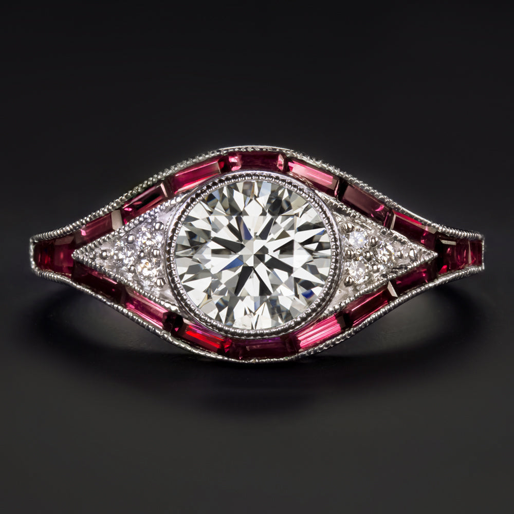 This diamond and ruby ring offers a stunning Art Deco style design, rich color, and gorgeous, substantial sparkle! It is an excellent choice for an engagement or cocktail ring.