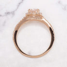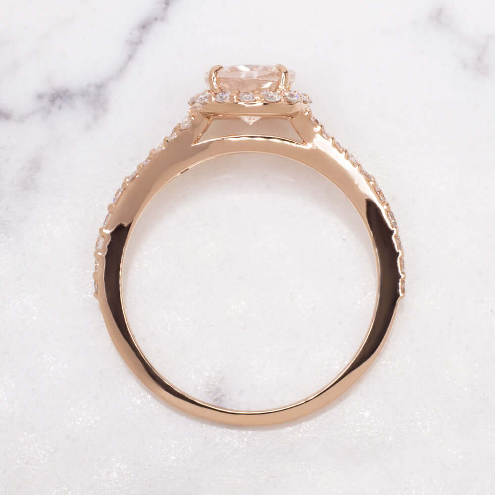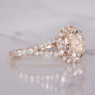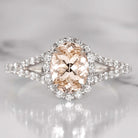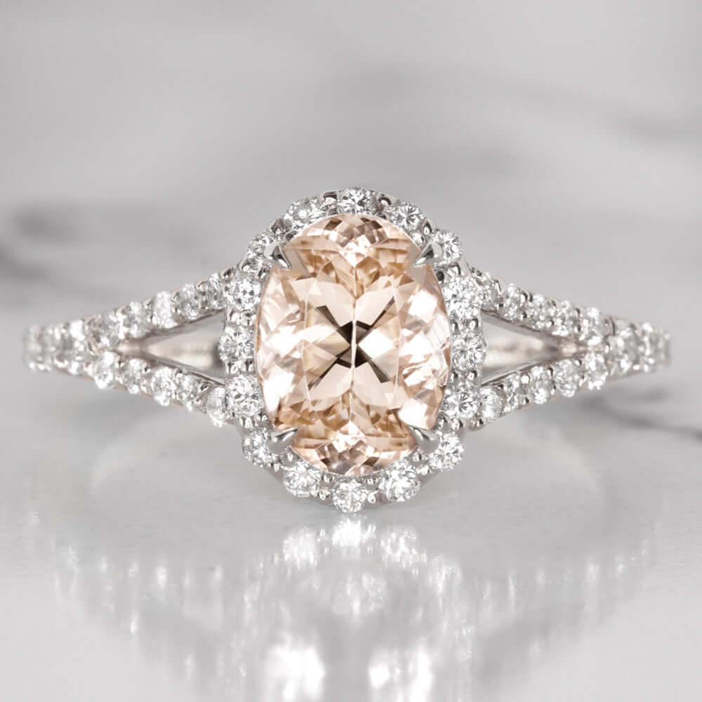 This chic morganite and diamond ring features a 1.23ct oval cut natural peach morganite surrounded by a sparkling halo of vibrant, bright white and very well cut natural diamonds. The morganite is a beautiful blush color reminiscent of rosé, and its stylish oval cut displays gorgeous sparkle. The slender yet sturdy split shank band shimmers with pave set diamonds for a fresh and flattering feminine look.