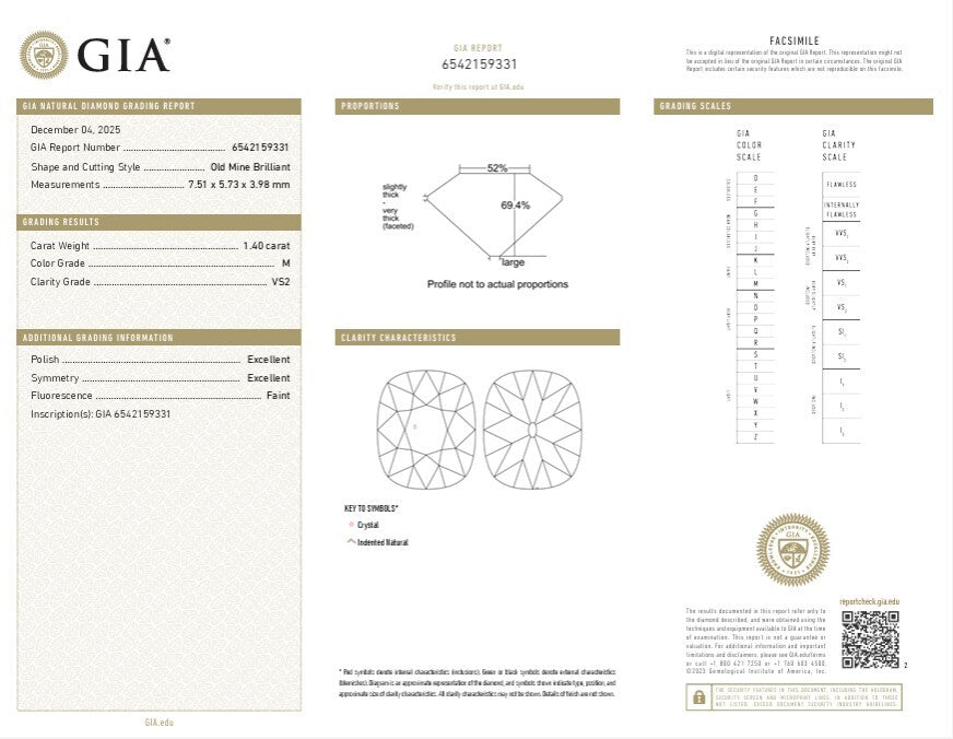 1.40ct OLD MINE CUT DIAMOND GIA CERTIFIED M VS2 ANTIQUE STYLE CUSHION ELONGATED