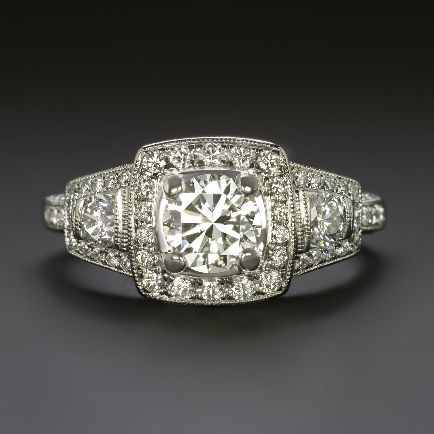 This striking diamond ring features an 0.82ct center diamond set in a sumptuous, diamond encrusted setting.